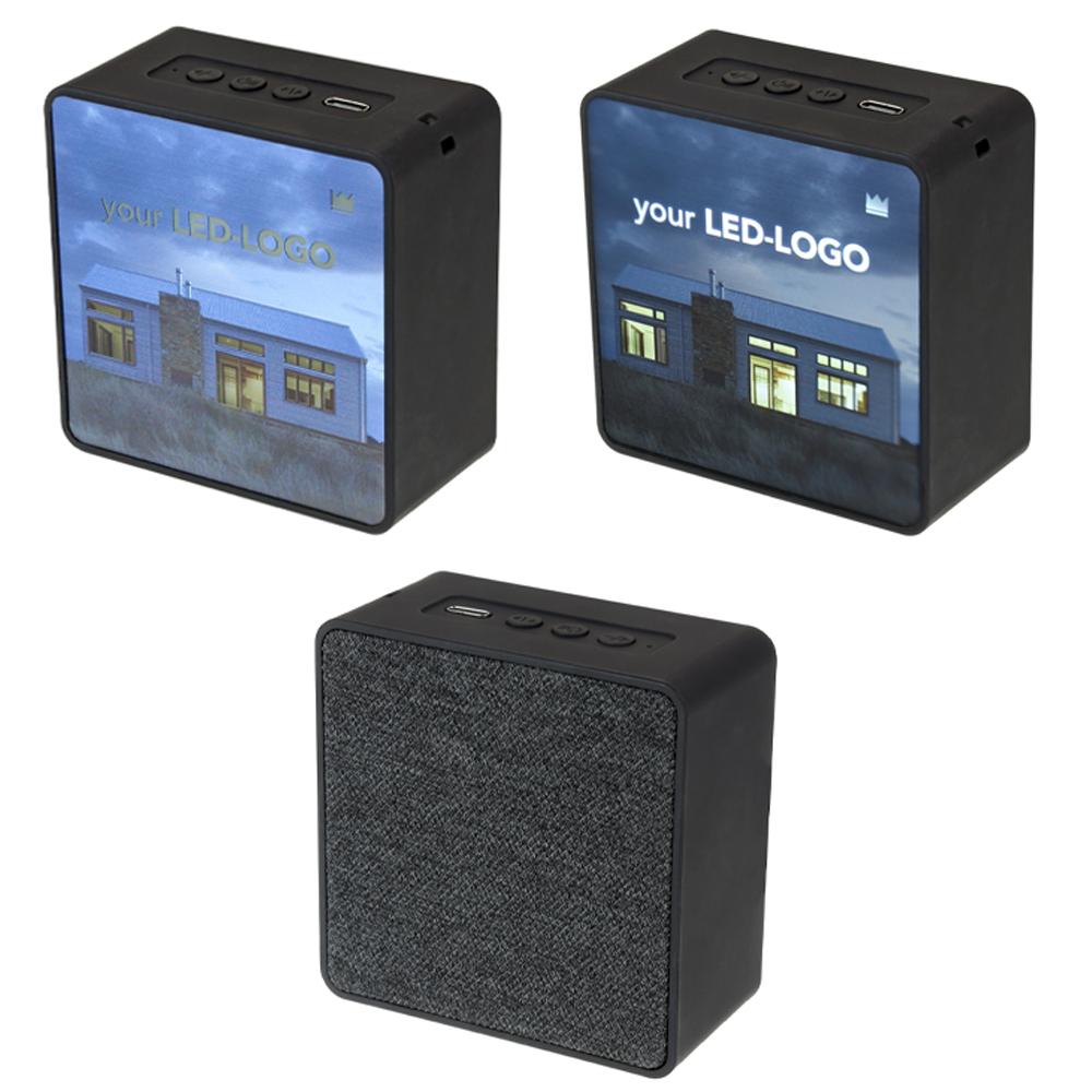 Kompakter Bluetooth-Speaker mit vollflächigem Leuchtmotiv nach Wunsch. Lieferung in braunem Einzelkarton.