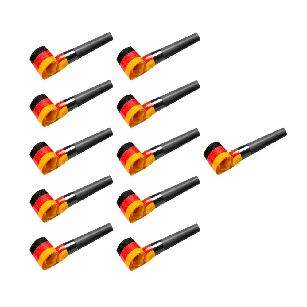 Klassische, lautstarke Tröte aus Kunststoff mit langem Papierrüssel, der sich beim Reinblasen ausrollt. Die Tröte ist schwarz und der Papierrüssel schwarz, rot, gelb. Zu 11 Stück im Polybeutel mit Papiereinleger verpackt.