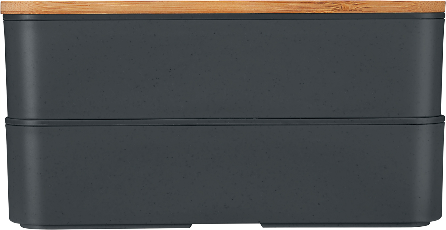 Nachhaltiges Doppel – mit Bambusdeckel und Besteck. Mit Elastikband und Besteckset.