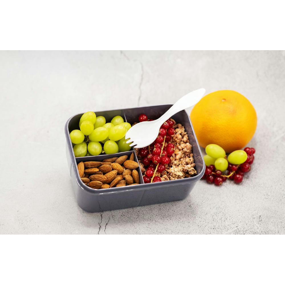 Auslaufsichere Lunchbox mit Inneneinteilung und Aufbewahrungsfach für den Göffel. Volumen 1300 ml