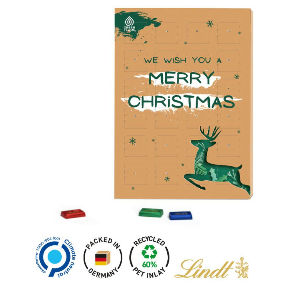 Wand Adventskalender mit Markenschokolade, in Vollkartonhülle, mit Papierblister, individuell bedruckt. Inhalt: 24 Lindt Schokotäfelchen, aus Milchschokolade in drei festlichen Farben bunt gemischt, 124 g. Saisonartikel - solange der Vorrat reicht!