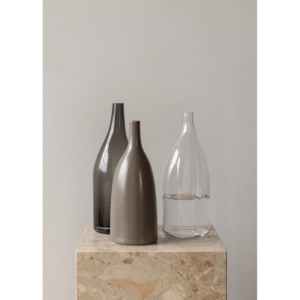 Die Kopenhagener Architekten Mentze Ottenstein ließen sich bei der Gestaltung ihrer Strandgade-Serie für MENU von ihrem Viertel inspirieren, benannt nach der historischen Straße, in der sie wohnen. Die Strandgade-Karaffe aus mundgeblasenem Glas hat eine asymmetrische Silhouette, die gut in der Hand liegt und das Ausgießen von Flüssigkeiten erleichtert. Sie wurde für das Servieren von Kaltgetränken entwickelt und vereint Funktion und Nostalgie. Die kleinere Flasche ist aus klarem Glas geformt, während die größere einen dunkleren Farbton aufweist. Jedes einzelne Design variiert in Größe und Form, da jedes Stück handgefertigt ist.