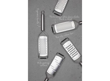 Die Microplane Professional Serie besticht durch Eleganz und ihr klares Design aus purem Edelstahl und zeichnet sich wie alle anderen Microplane-Reiben durch die gewohnten photo-geätzten Klingen - made in USA - aus, durch deren Schärfe Sie Lebensmittel zerschneiden anstatt sie zu zerdrücken. Aroma und Geschmack können sich auf diese Weise voll entfalten. Mit der feinen Klinge zesten Sie Zitrusschalen und schneiden Hartkäse, Gewürze wie Muskatnuss, Zimt und Schokolade, Ingwer Knoblauch uvm. präzise und sehr fein. Ohne jeglichen Kraftaufwand und durch die breite Reibfläche reiben Sie effizient und wunschgemäß. Folgende Klingenausführungen sind in dieser Serie erhältlich: Grob, 2-Wege-Schneide, Fein, Große Raspel, Sehr Grob.