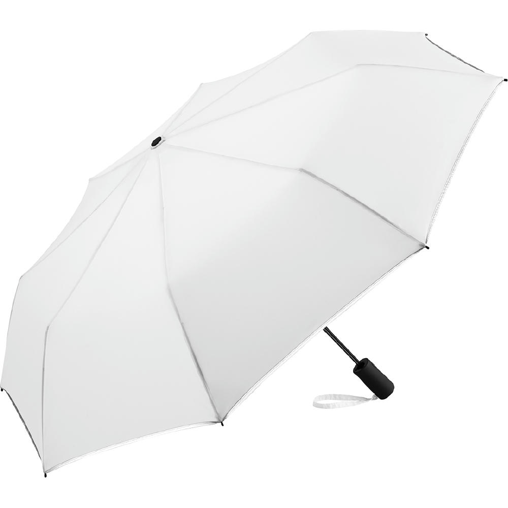 Stabiler Automatik-Taschenschirm mit modisch reflektierender Paspelierung. Komfortable Automatik-Funktion zum schnellen Öffnen, hochwertiges Windproof-PLUS-System für eine maximale Gestell-Flexibilität bei stärkeren Windböen, Bezug mit modischer Reflexpaspel in silber, Soft-Touch-Griff mit glänzender Auslösetaste und Werbeanbringungsmöglichkeit, Futteral mit modischer Reflexpaspel