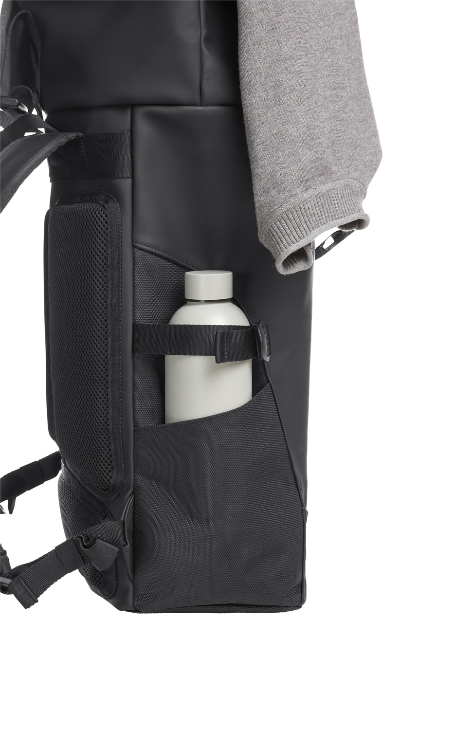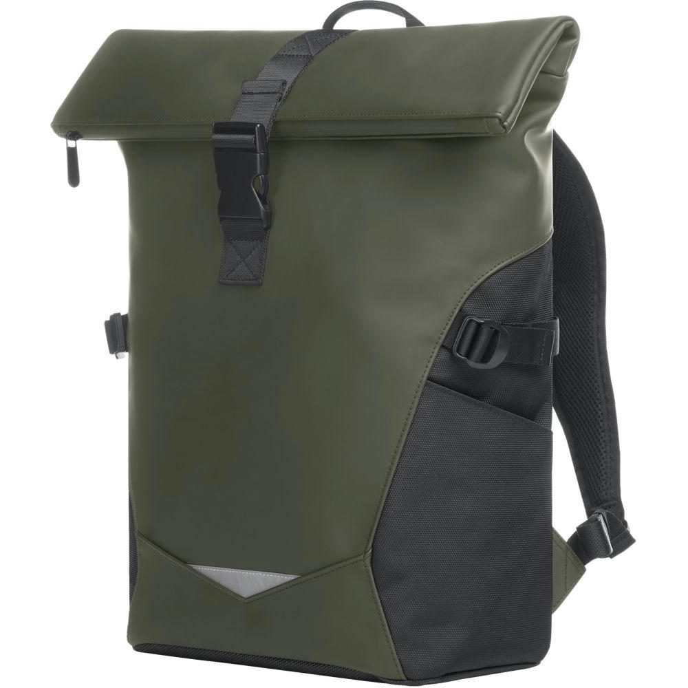 dynamischer Rolltop-Rucksack; Reißverschluss-Hauptfach mit Steckverschluss; große Reißverschluss-Vortasche; zwei seitliche Einsteckfächer; Fixiergurte; dekorativer Reflexeinsatz auf der Front; innen gepolstertes Einsteckfach mit Klettsicherung; verstecktes Reißverschluss-Fach rückseitig; aufwändig gepolstertes Tragesystem mit individuell einstellbarem Brustgurt; Hand- sowie Tragegriff