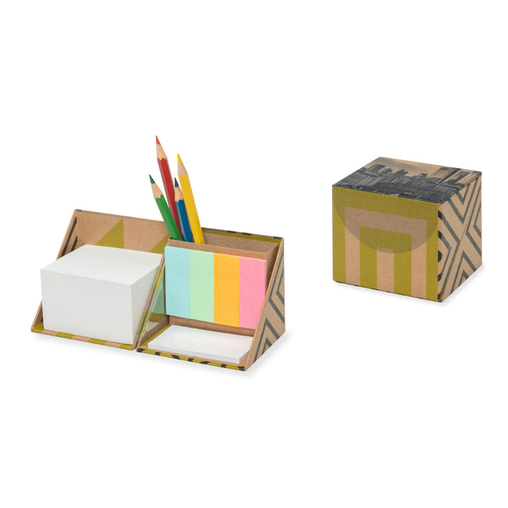Inhalt: Notizblock (380 Blatt), Haftnotizen (25 Blatt), Papier-Indexstreifen (4x 25 St.) und Ablage für Schreibgeräte – alles aus recyceltem Papier. Der Würfel ist diagonal zu öffnen und mit braunem Recycling-Papier ummantelt (keine zusätzliche Folienkaschierung). Einzeln mit neutraler Banderole verschlossen. Außenflächen des Würfels 4c-gestaltbar, Notizblock/Haftnotizen 1–2c bedruckbar. Preis inkl. Werbeanbringung.