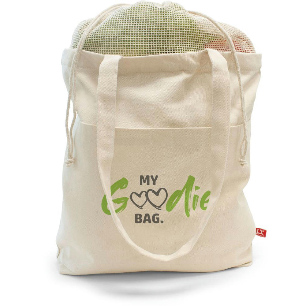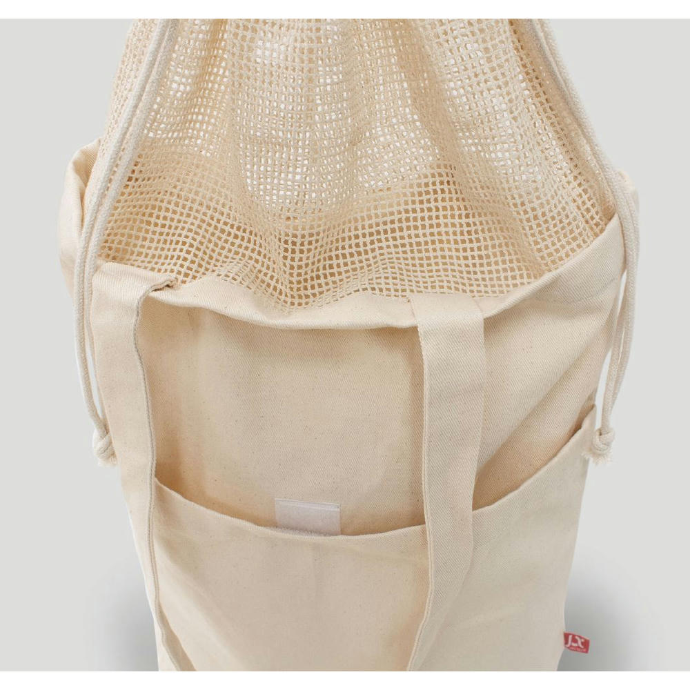 Aus 100 % OEKO-TEX® Baumwolle, 260 g/m2, mit langen Henkeln und ausziehbarem Baumwollnetz.