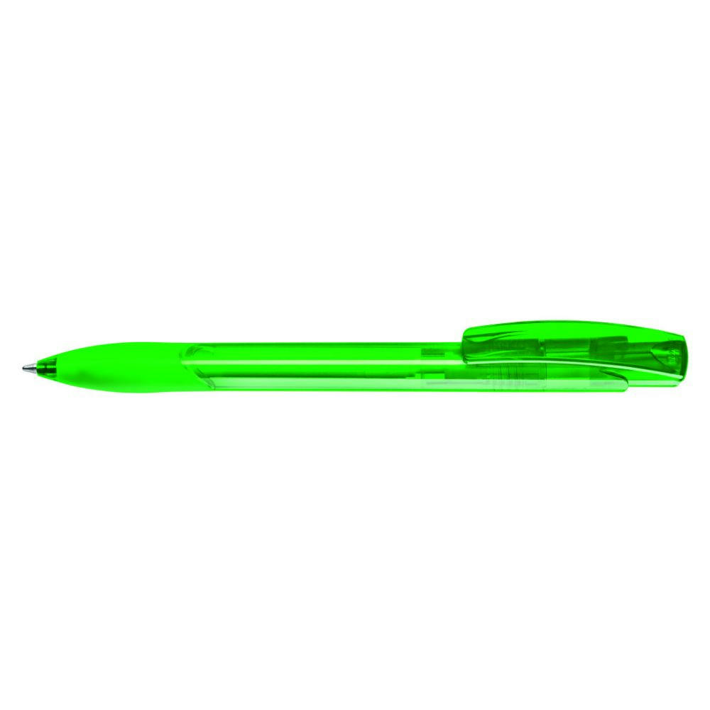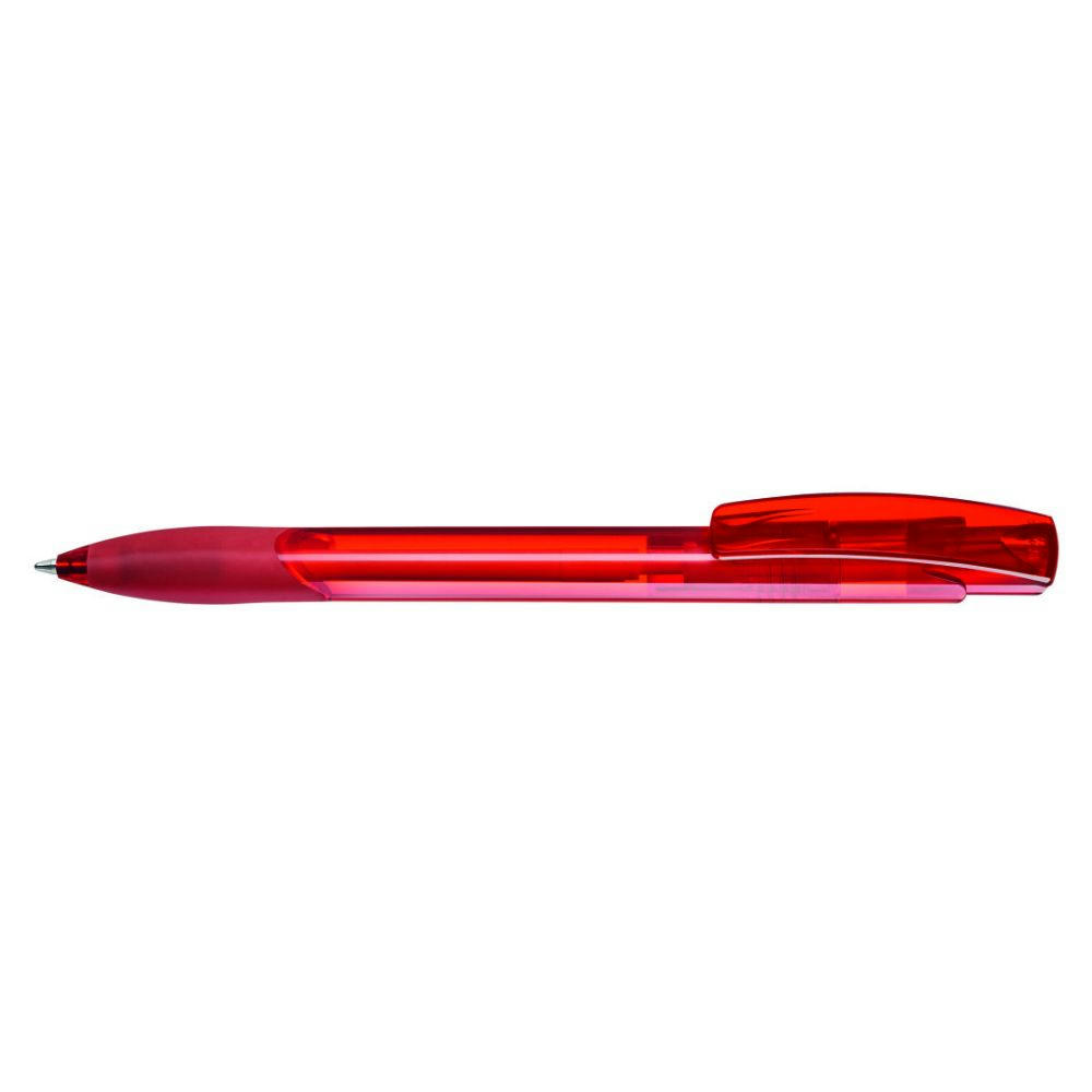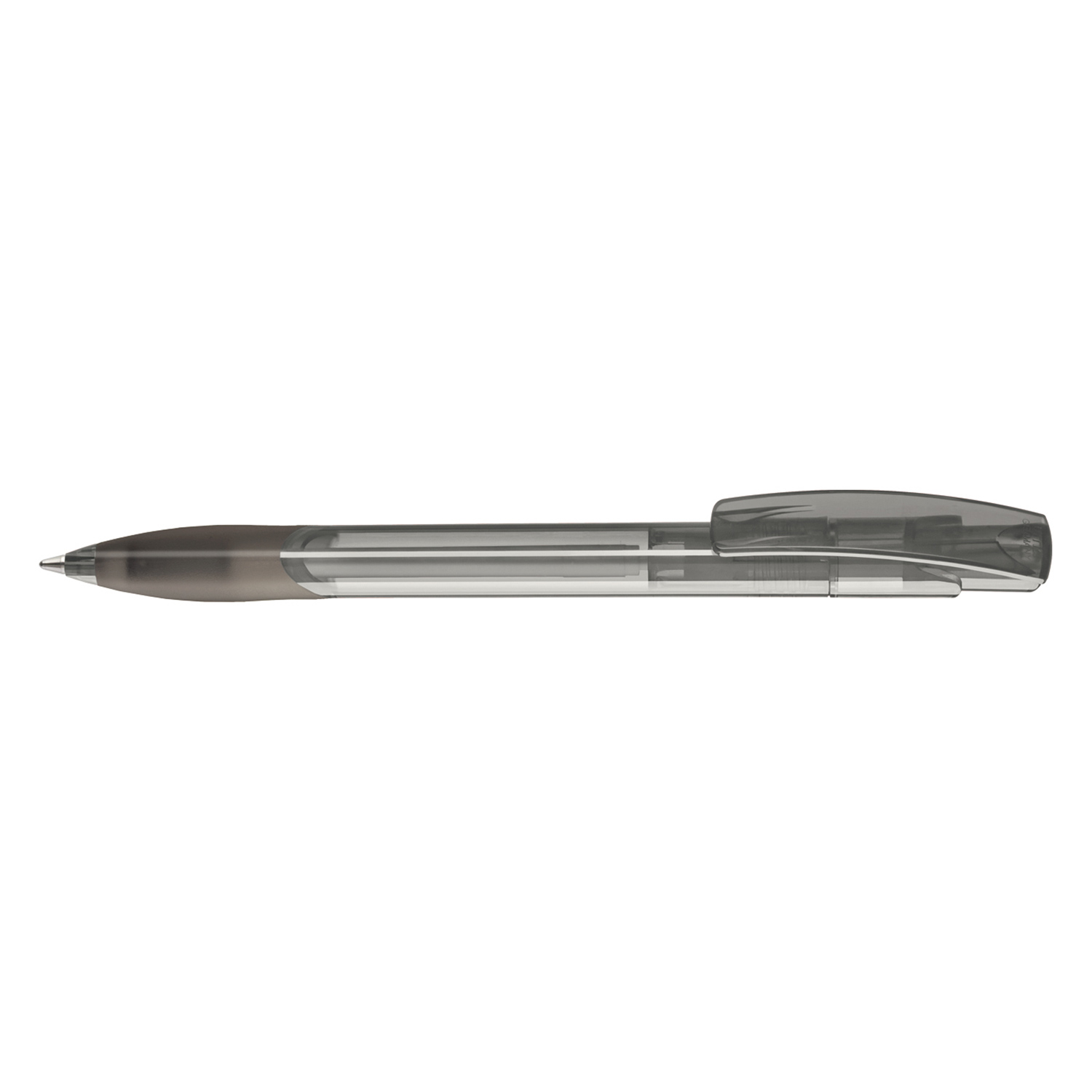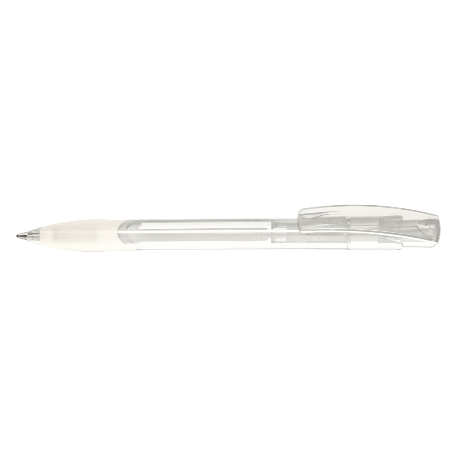 Druckkugelschreiber mit transparent glänzendem Schaft, Gummigriffzone und Clipdrücker.