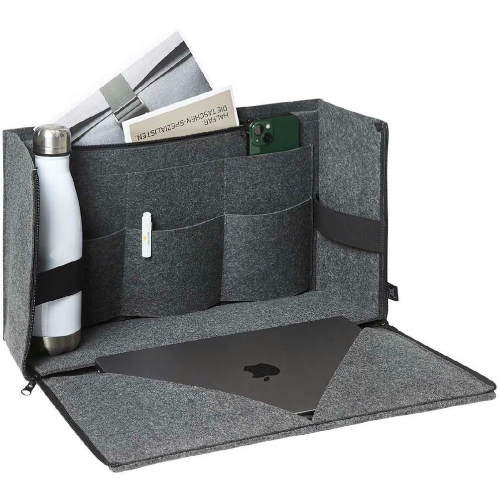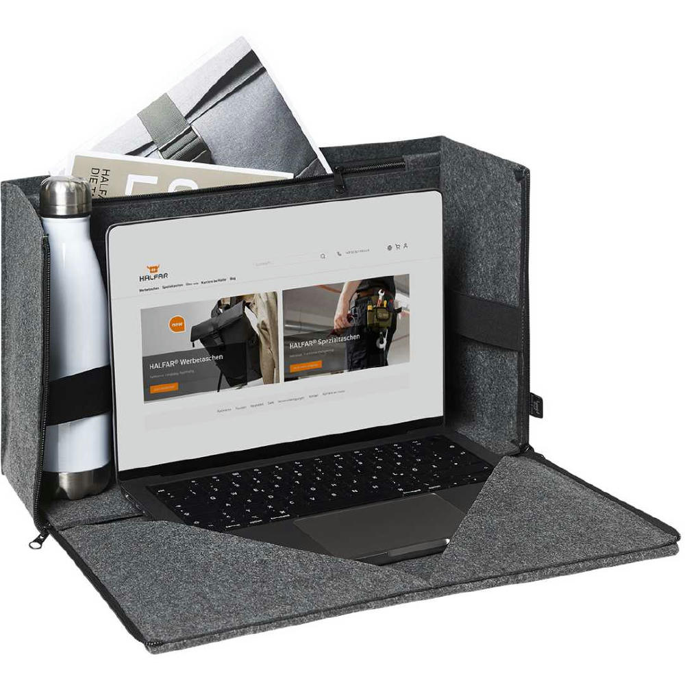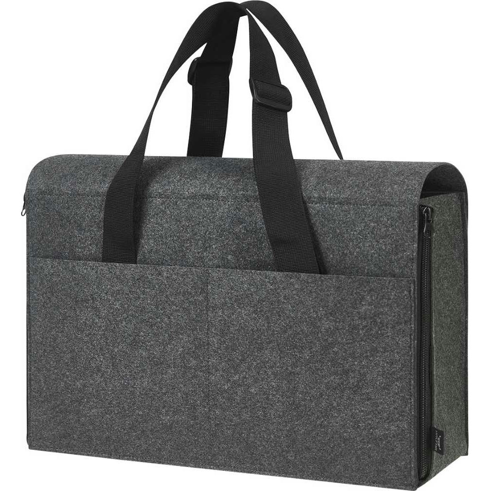 umfangreich ausgestatteter Organizer mit großem Hauptfach; Schnellöffnungsfunktion für mobiles Arbeiten; mit und ohne Überschlag nutzbar; gepolsterter Boden; Laptop-Halterung; flaches Einsteckfach auf der Front; zwei Einsteckfächer rückseitig; zwei Fixierungsschlaufen z.B. für Getränkeflasche; drei flache Einsteckfächer innen; drei Einsteckschlaufen innen; flache Reißverschluss-Tasche innen; längenverstellbare Tragegurte