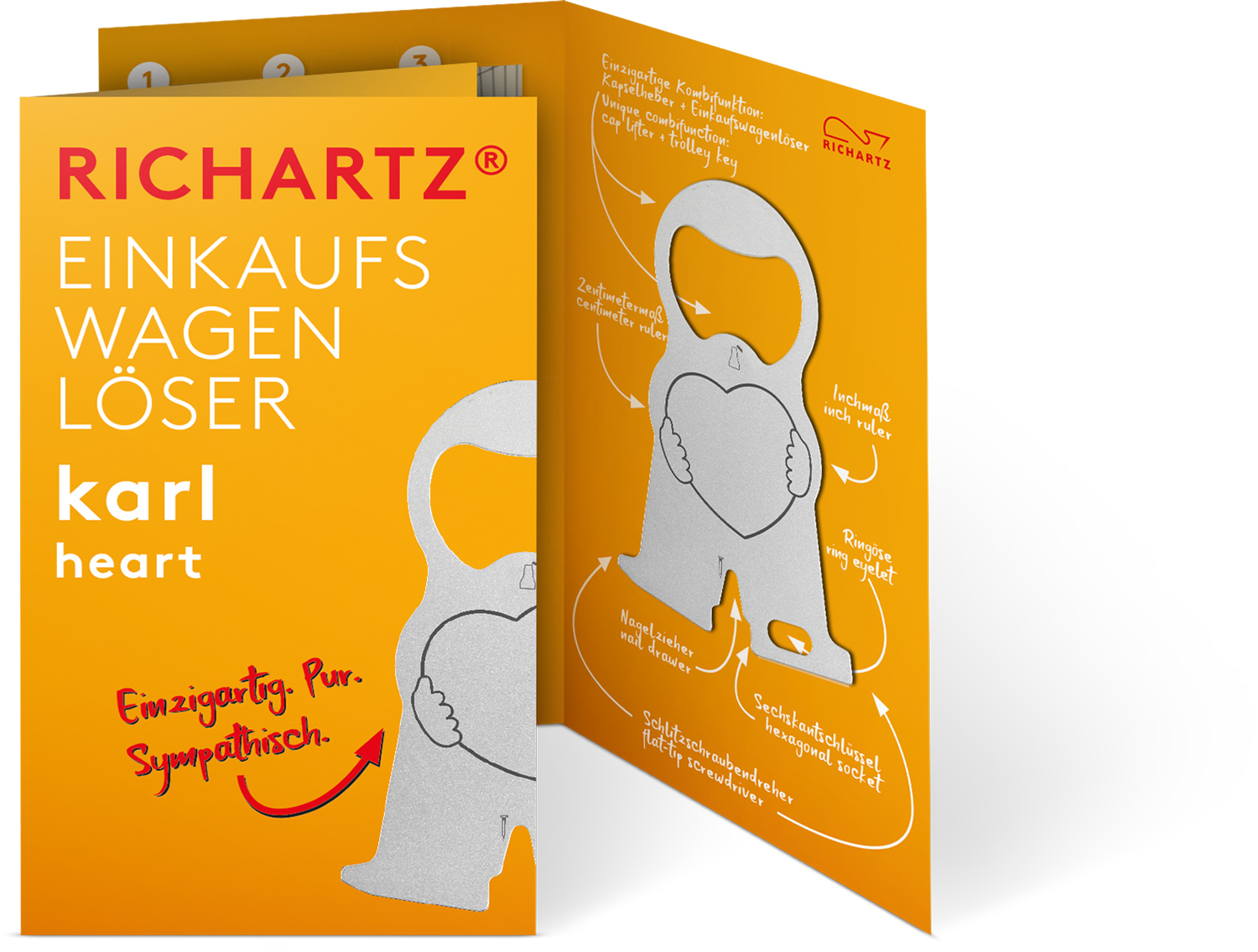 Jedes Karl family Mitglied steht Pate für ein Berufsfeld, eine Branche oder eine sympathische Geste und bringt somit passgenaue Botschaften an Ihre Kunden. Weitere Motive auf Anfrage. Kombifunktion aus Kapselheber + Einkaufswagenlöser, Zentimetermaß, Inchmaß, Ringöse, Nagelzieher, Sechskantschlüssel, Schlitzschraubendreher. Preis inkl. indiv. 4/4-c bedruckbarer Verpackung und inkl. Lasergravur auf dem Tool.