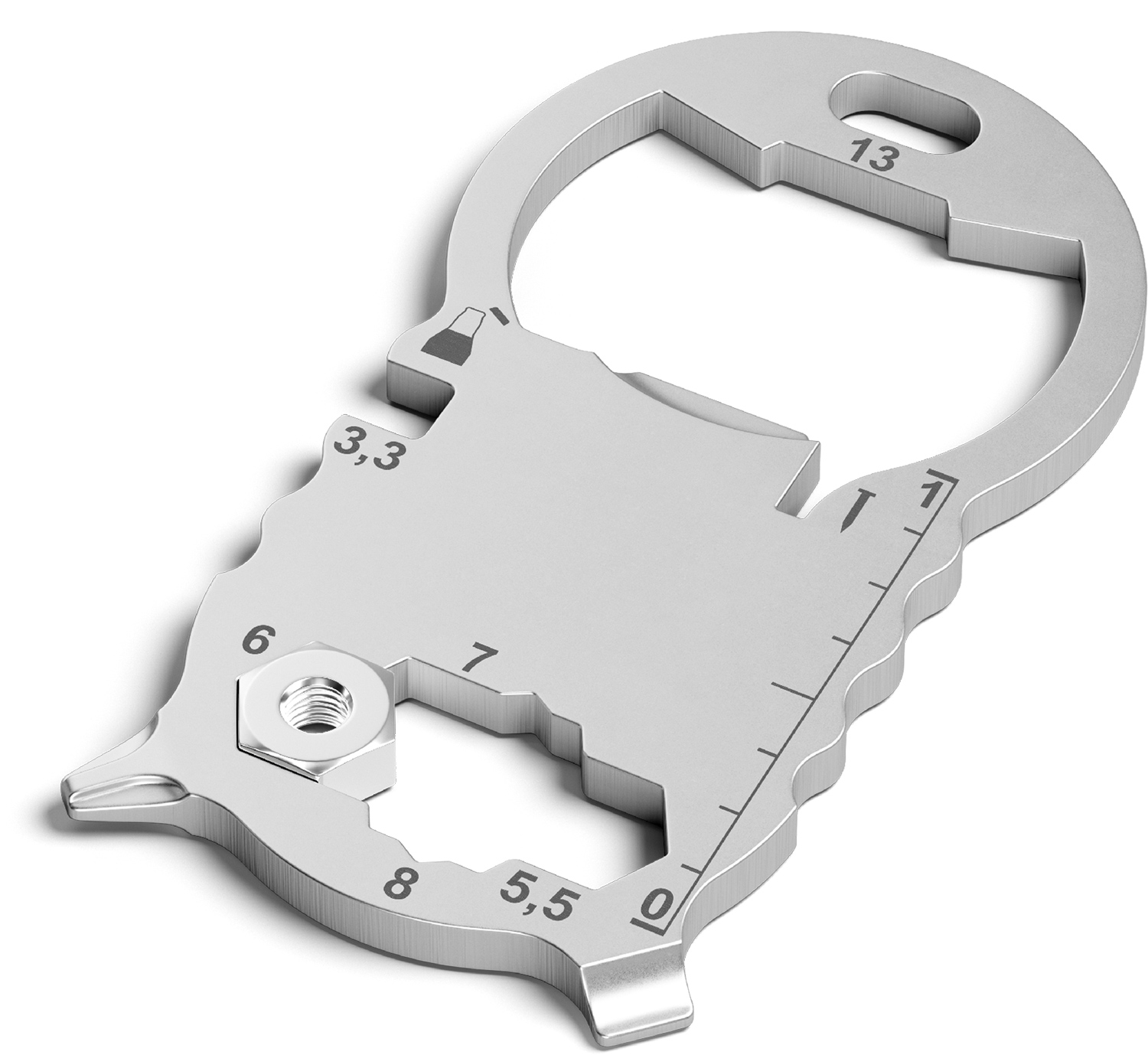 Kleines, kompaktes Multitool mit 13 Funktionen, aus hochwertigem, matt gestrahltem Edelstahl gefertigt. Passt an jeden Schlüsselbund. Inkl. Lasergravur und individuell gestalteter Verpackung.