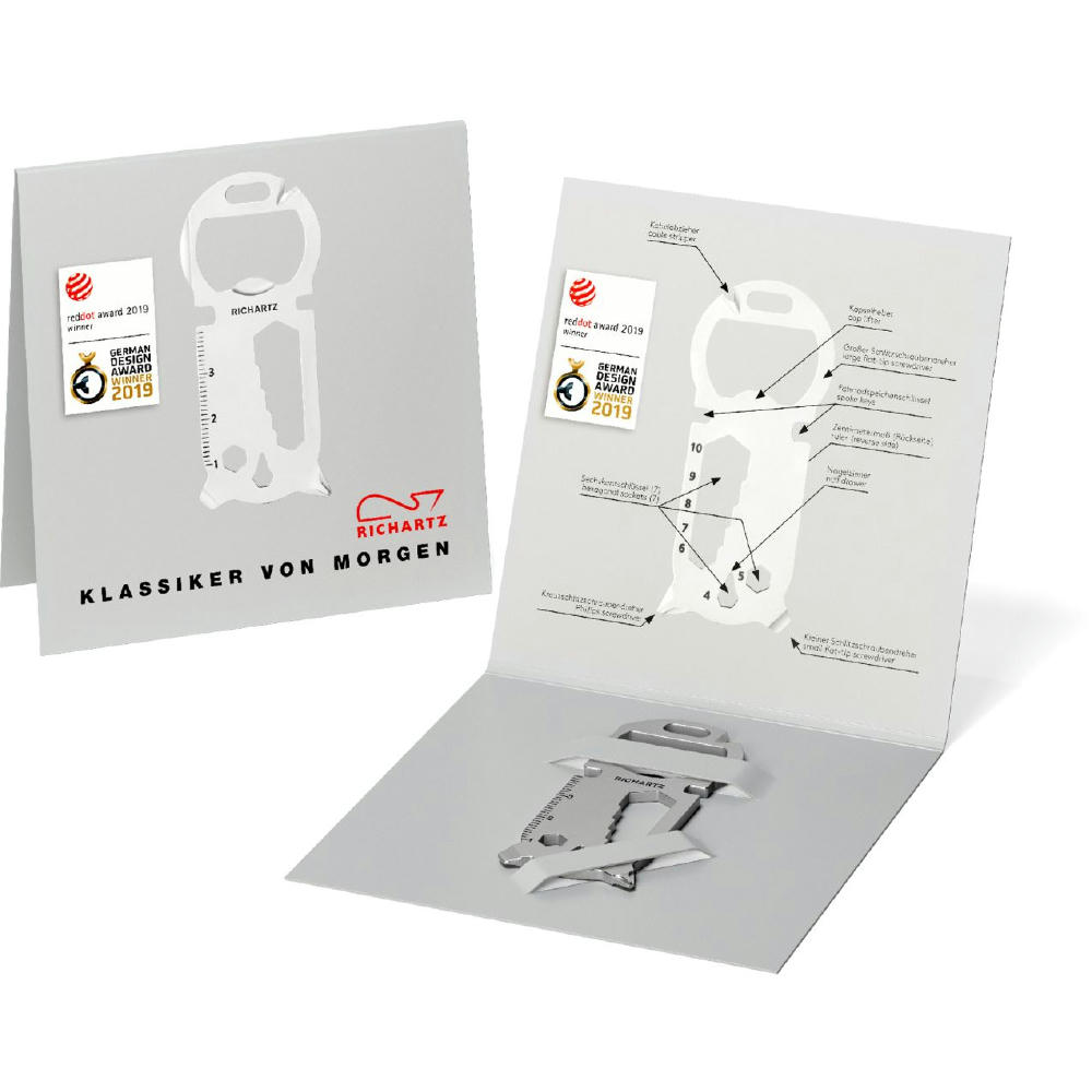 Das kompakte Multifunktionstool ist ein unentbehrlicher Begleiter und passt an jeden Schlüsselbund! 16 Funktionen: Kapselheber, kleiner und großer Schlitzschraubendreher, Kreuzschlitzschraubendreher, Kabelabzieher, zwei Fahrradspeichenschlüssel, sieben Sechskantschlüssel, Zentimetermaß, Nagelzieher. Ab 250 St. indiv. Verpackungsdruck und Lasergravur auf Produkt gegen Aufpreis möglich.