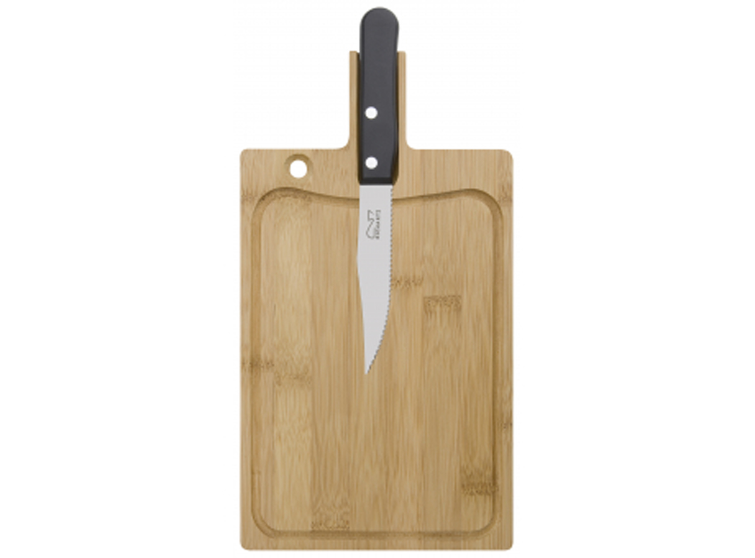 Scharfes Steakmesser mit einem praktischen Schneidbrett aus Holz. Die umlaufende Saftrille macht das Arbeiten besonders einfach. Das Steakmesser wird durch einen Magneten perfekt in der Mulde des Holzbretts gehalten. Außergewöhnlich und praktisch.