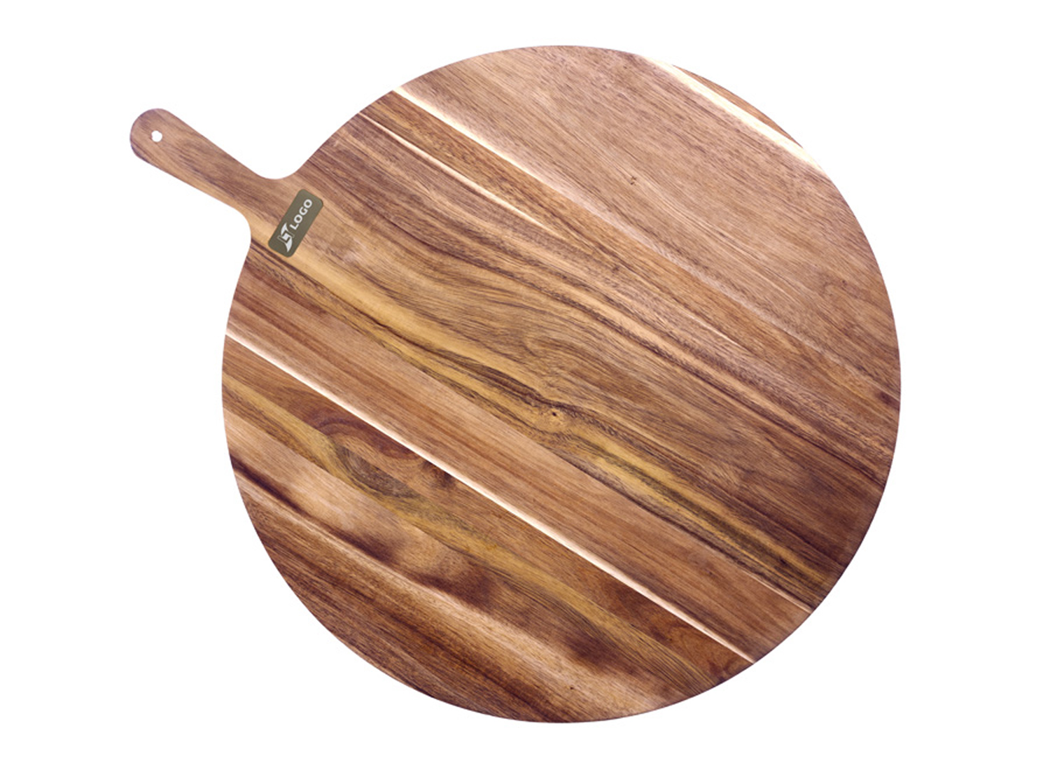 Massive Akazie. Metallplättchen mit Titan-Finish. Lederband. Kann auch als Präsentationsbrett verwendet werden. Akazie ist aufgrund seiner Härte und Feuchtigkeitsbeständigkeit für Schneidebretter perfekt geeignet.