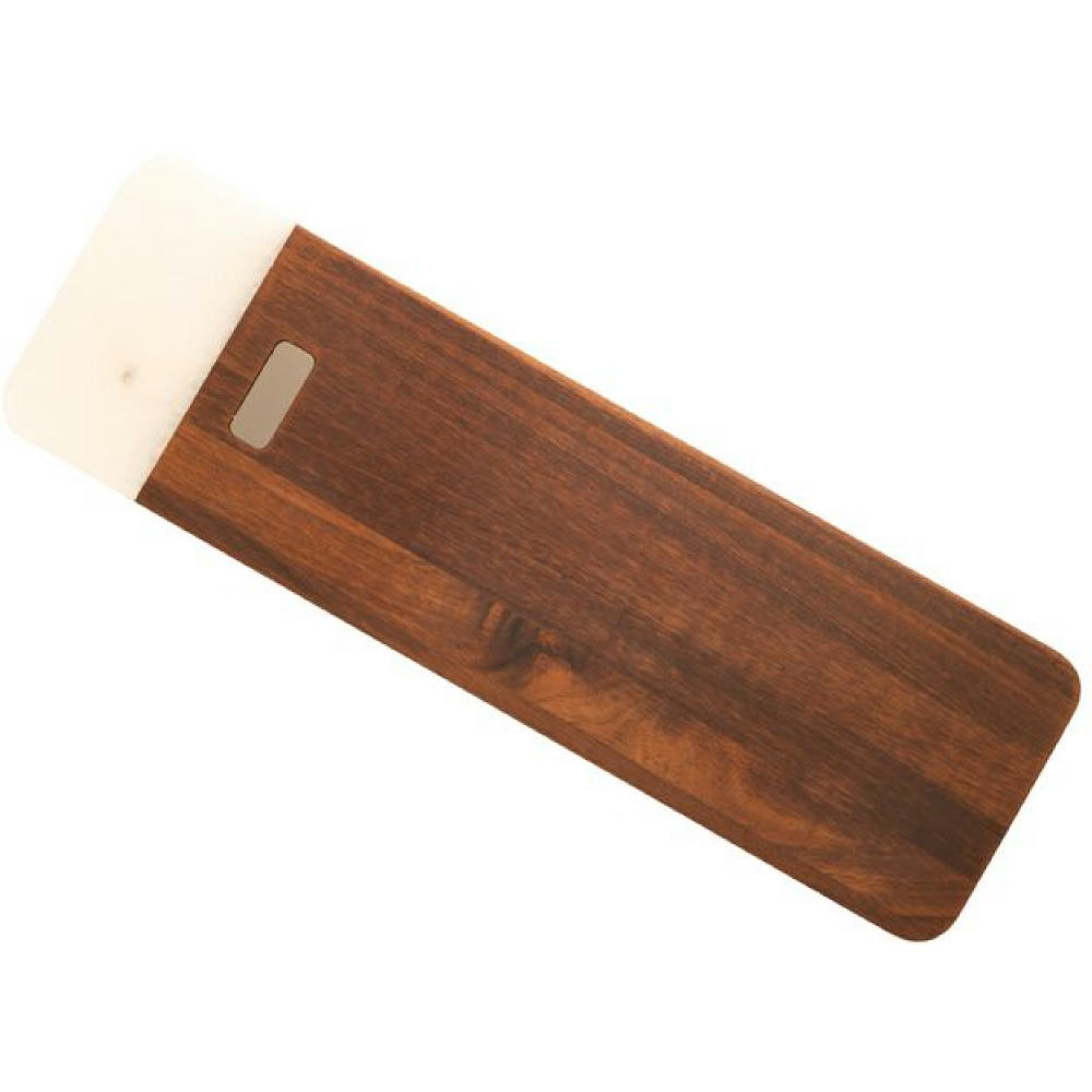 Massives Akazienholzbrett mit weißem Marmor. Metallplättchen mit Titan-Finish. Kann auch als Präsentationsbrett verwendet werden. Akazie ist aufgrund seiner Härte und Feuchtigkeitsbeständigkeit für Schneidebretter perfekt geeignet. Der weiße Marmor verstärkt die visuelle Eleganz dieses Bretts.