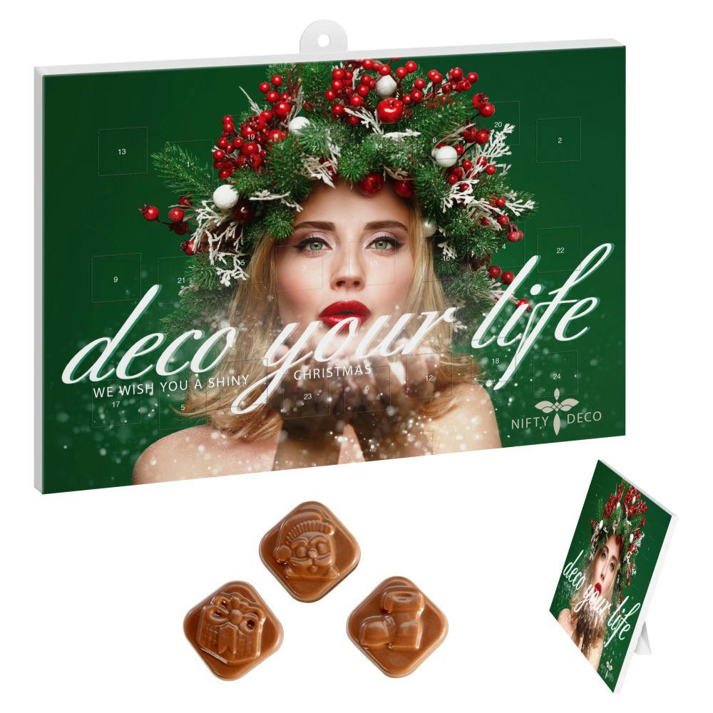 Wand-/Tisch-Adventskalender im Hoch- oder Querformat mit stabilem Tiefziehteil, 24 Türchen gefüllt mit Vollmilchschokolade, 3-fach verklebt. Vollmilchschokolade mit mindestens 30 % Kakao. Haltbarkeit: ca. 6 Monate.