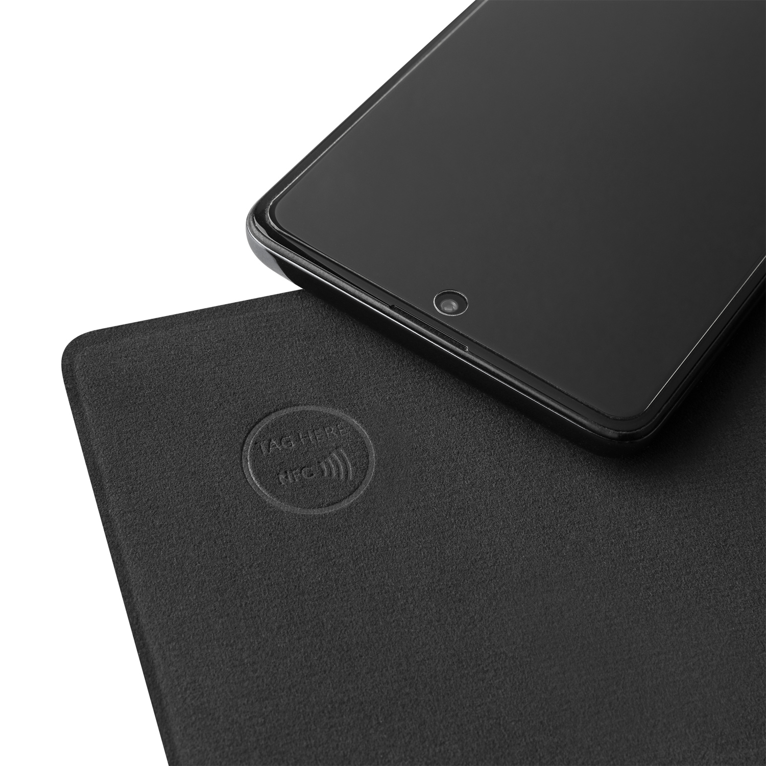 Digital meets Classic – NFC Business & Travel Mobile Office Notebook (aus recycelten PET Flaschen) mit praktischem aufstellbarem Handy/Touchpenorganizer, A5 Schreibblock (50 Seiten, austauschbar), digital: auf dem integrierten NFC Chip kann Ihre individuelle Webseite sofort aufrufbar für den Kunden hinterlegt werden, mit edler Magnetschließe.
