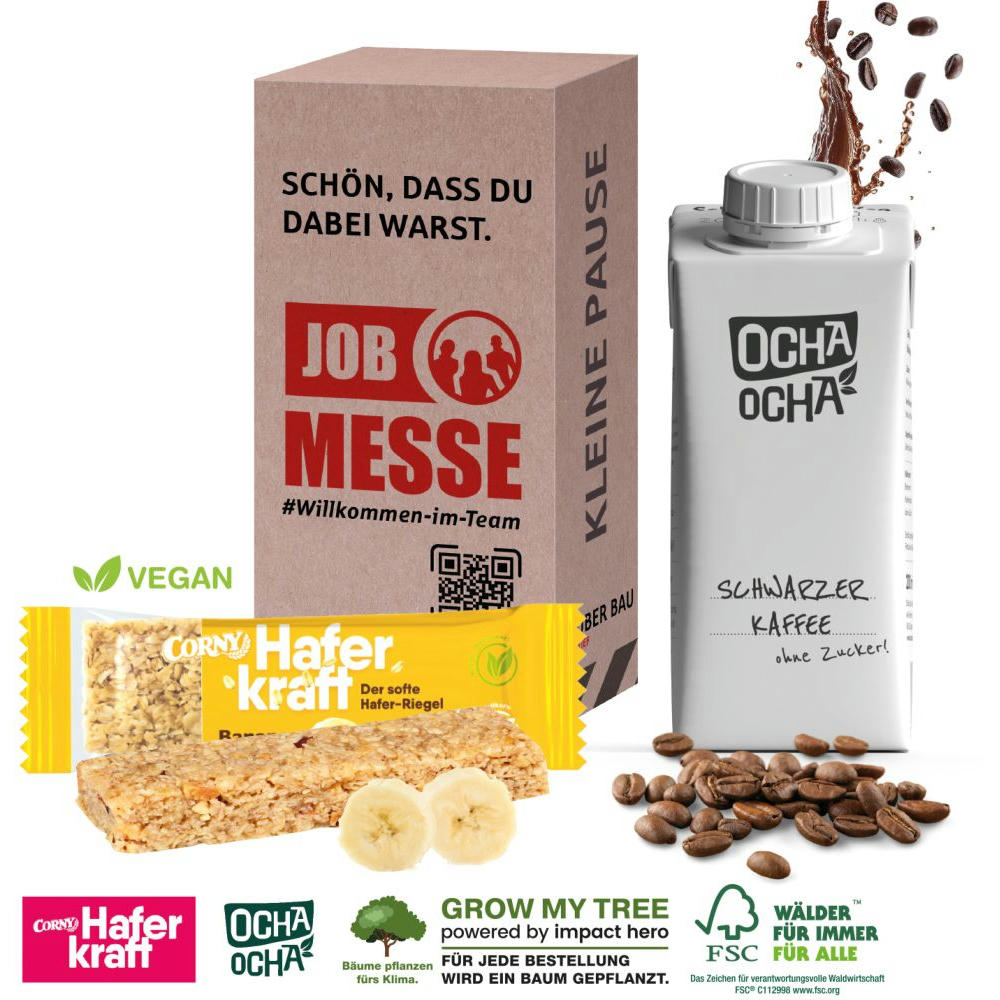 Auf Messen, Veranstaltungen oder auf Reisen ist der kleine Snack Pack das ideale Präsent. Gefüllt mit einem Corny Haferkraft Riegel und einem Ocha Ocha schwarzen Kaffee ohne Zucker. Individuell bedruckbare Werbekartonage. Inkl. 4c-Druck. Für jede Bestellung wird ein Baum über GROW MY TREE gepflanzt.
