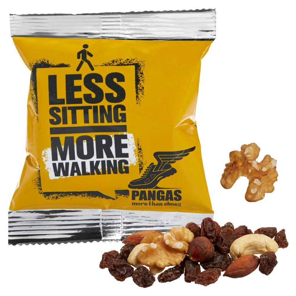 Nuss-Kernmischung (Mandeln, Walnusskerne, Haselnusskerne, Cashewkerne) und Sultaninen, in glänzend- oder matt-kaschiertem alubedampften Werbetütchen verpackt. Maße: ca. 12 x 9,5 cm, Inhalt: ca. 15 g. Haltbarkeit: ca. 6 Monate.