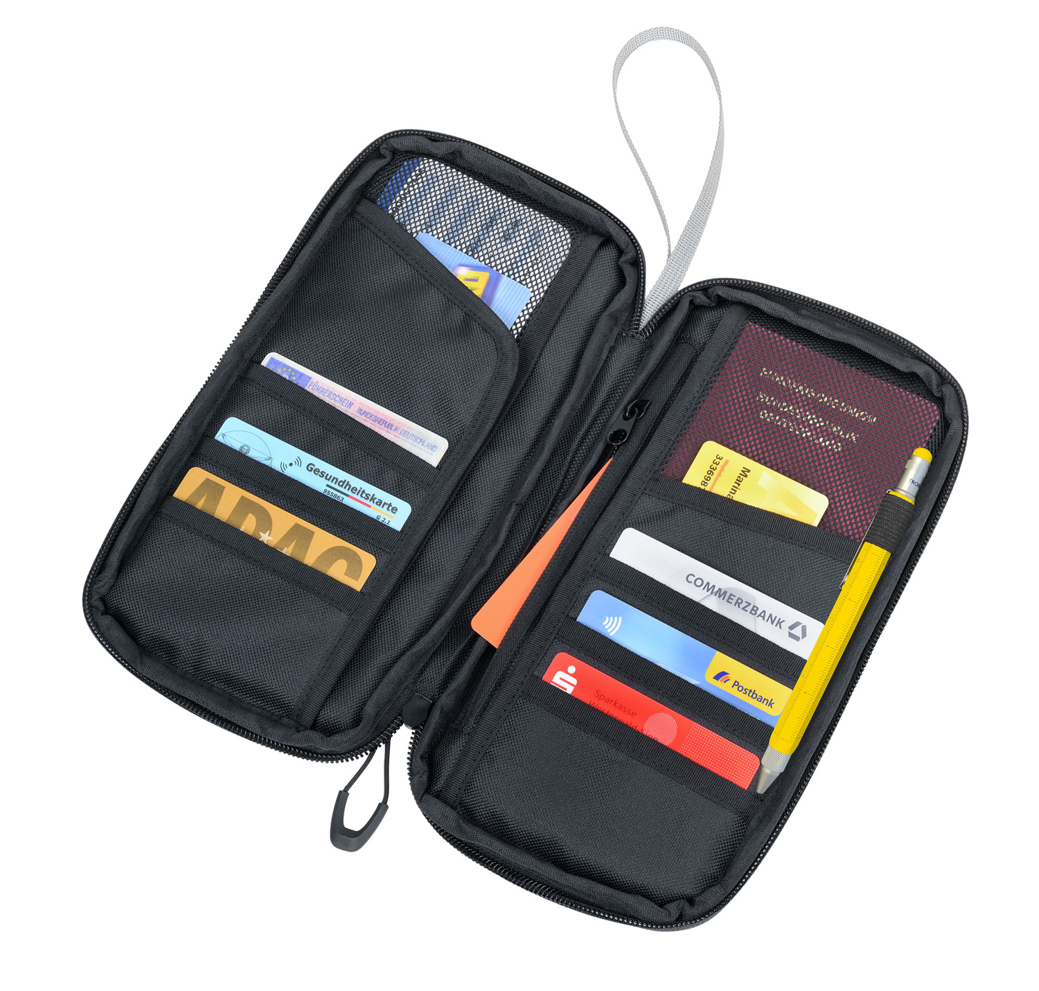 Etui für Reisedokumente, mit wasserfesten Reißverschlüssen und Handschlaufe, stark reflektierend, Fronttasche passend für Smartphone oder Reisepass, 11 Innenfächer für Karten und Reiseunterlagen, Stiftschlaufe.
