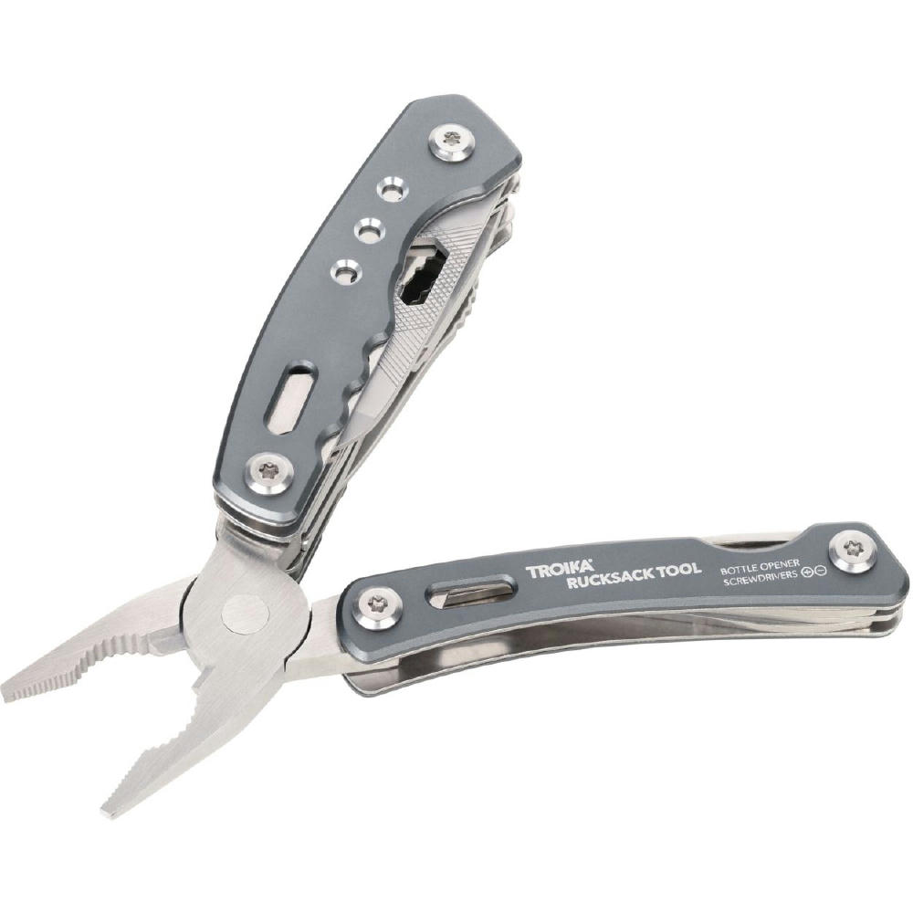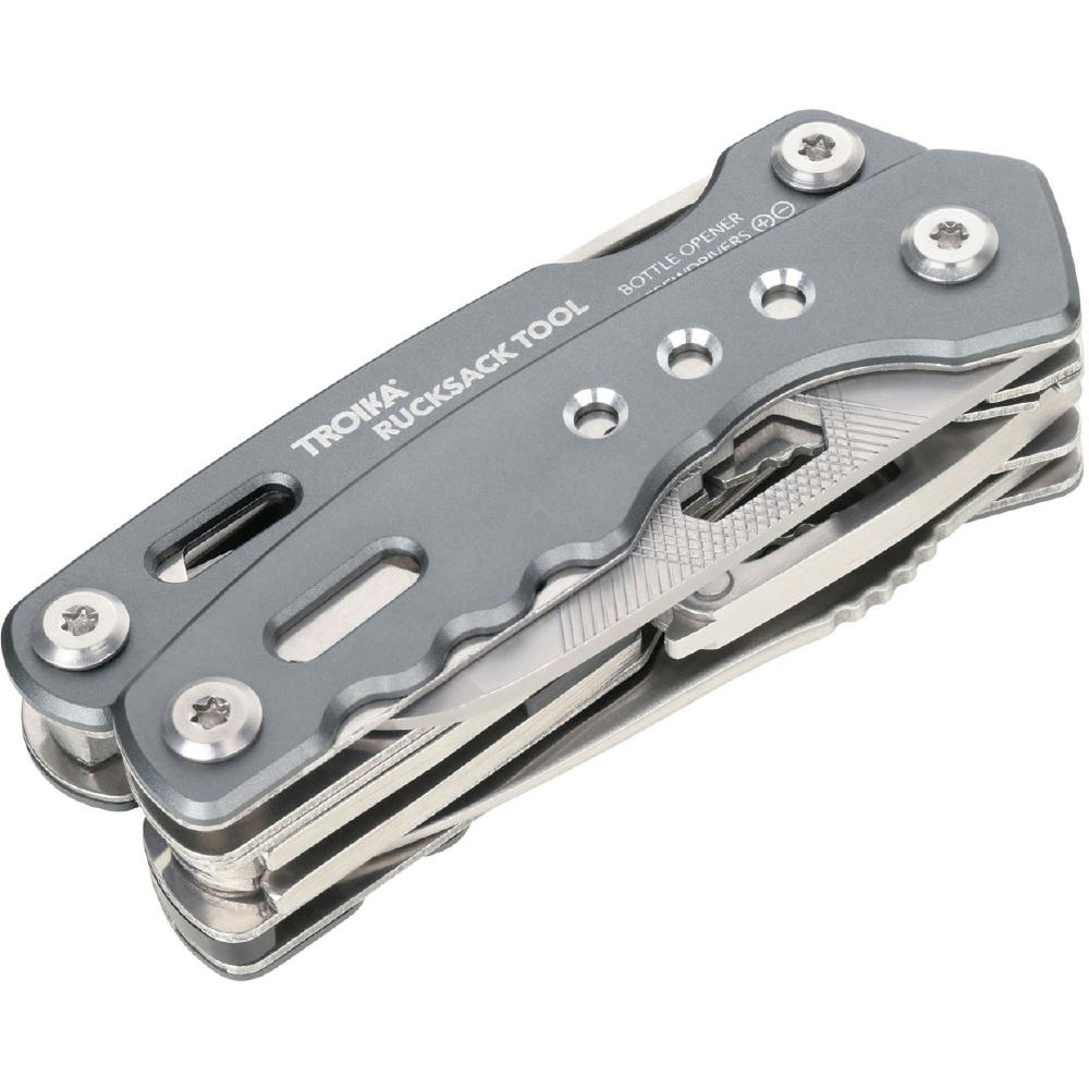 Multifunktions-Werkzeug Rucksack Tool mit 15 Funktionen, integrierte Feder und Feststellfunktion, Spitzzange, Zange, Seitenschneider, Messer, Säge, Schlitzschraubendreher, Dosenöffner, Feile, Karabiner, Flaschenöffner, Sechskant-Schraubenschlüssel, Werkzeuge im eingeklappten Zustand außenliegend, in Nylontasche mit Gürtelschlaufe, 420 Edelstahl, Aluminium, eloxiert, matt.