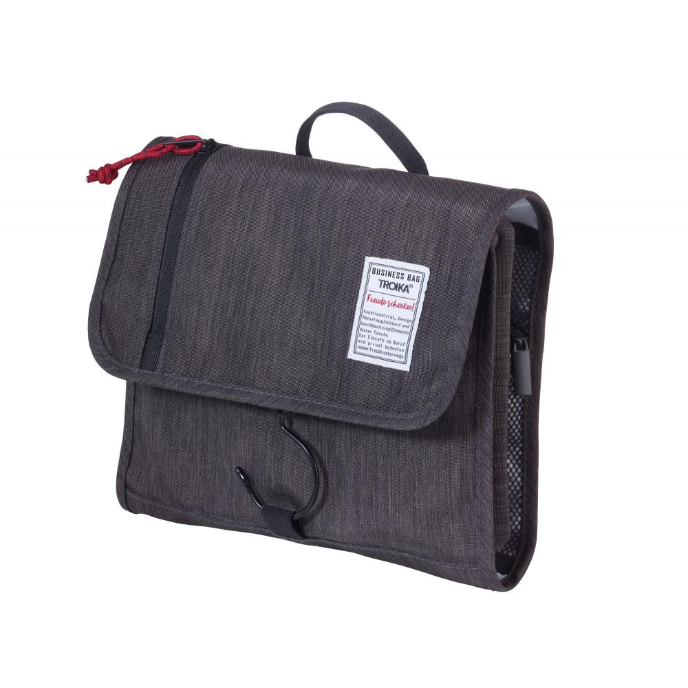 Reise-Kulturtasche mit Haken zum Aufhängen und als Schließe, Innen: atmungsaktives Netzfach mit Reißverschluss und Steckfächern, 2 Reißverschlussfächer mit Netz und PVC Beschichtung (Schutz vor Flüssigkeiten), Fronttasche mit Reißverschluss