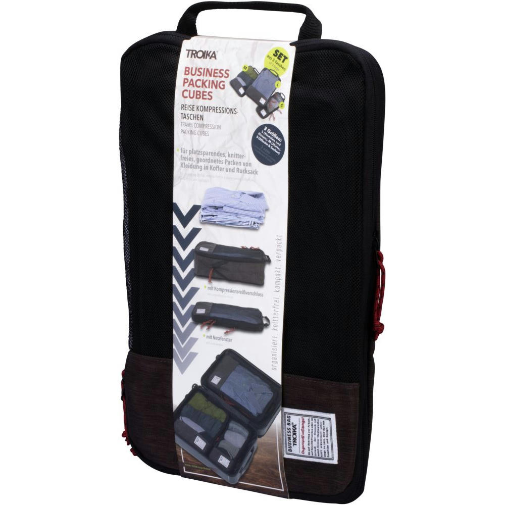 Kompressionstaschen-Set: 3 Packtaschen mit Reißverschluss und zusätzlichem Kompressionsreißverschluss für platzsparendes, geordnetes und knitterfreies Packen von Kleidung in Koffer & Rucksack, 3 Größen: L (Hemden & Hosen), M (Shirts), S (Wäsche & Socken), jeweils mit Netzfenster und Tragegriff. Material: Polyester. Farben: anthrazit, schwarz. Maße: 39 x 27 x 4 x cm, Gewicht: 445 g