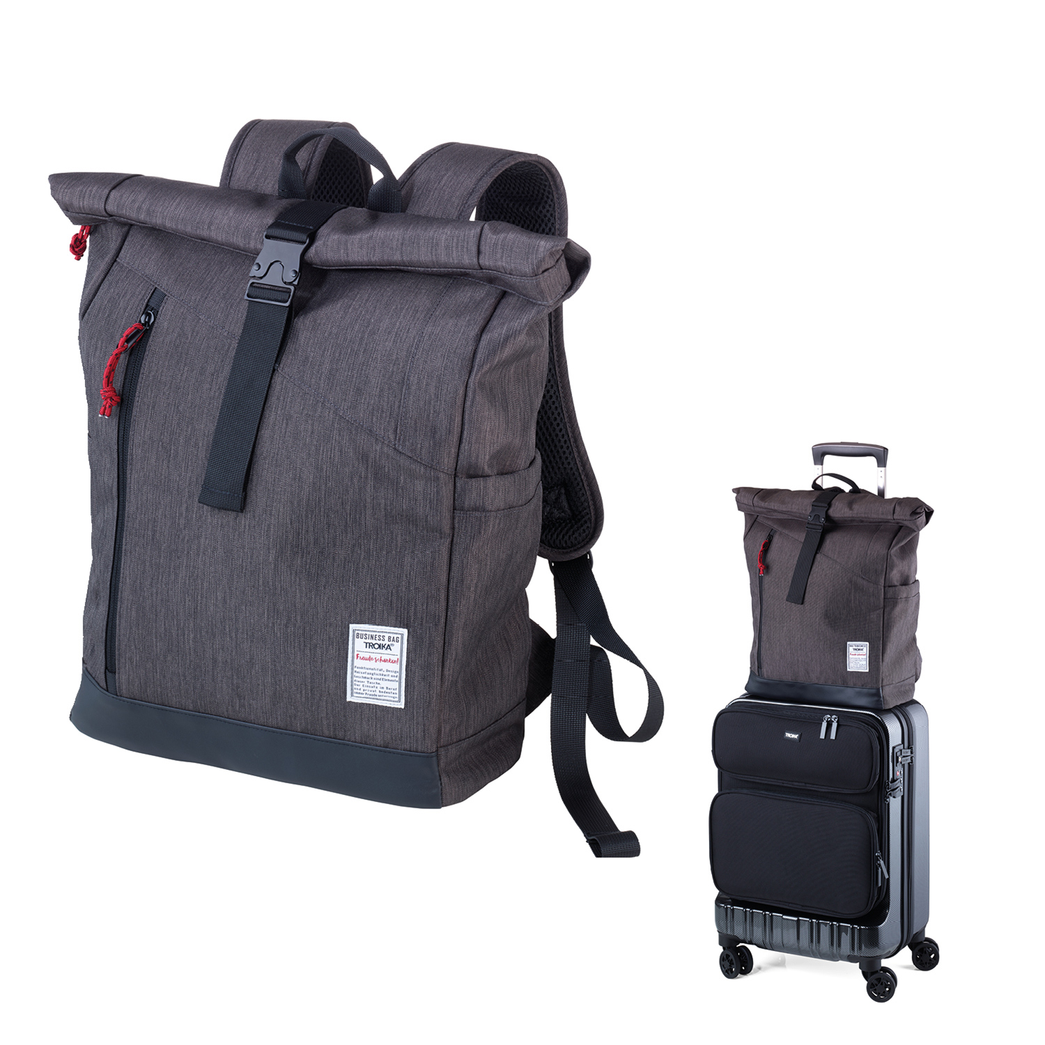 Mit Steckverschluss aus Metall, Hauptfach mit Reißverschlussfach und 2-fach unterteiltem Einschubfach mit Klettverschluss, Fronttasche mit Reißverschluss, 2 Seitentaschen, rückseitiges Geheimfach, gepolsterte Schultergurte, abgesetzter Standboden. Tragkraft bis zu 15 kg. Material: Polyester. Farben: anthrazit, schwarz.