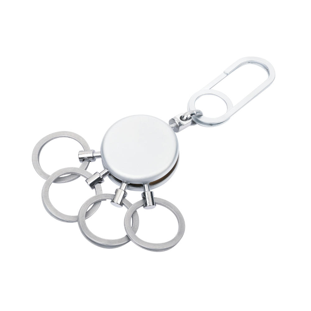 Schlüsselanhänger, rund, inkl. Karabinerhaken, 4 ausklinkbare Ringe, schnelles & einfaches Anbringen der Schlüssel dank patentiertem Öffnungsmechanismus (TROIKA NAIL GUARD), Messing, Metall, verchromt, matt, silberfarben