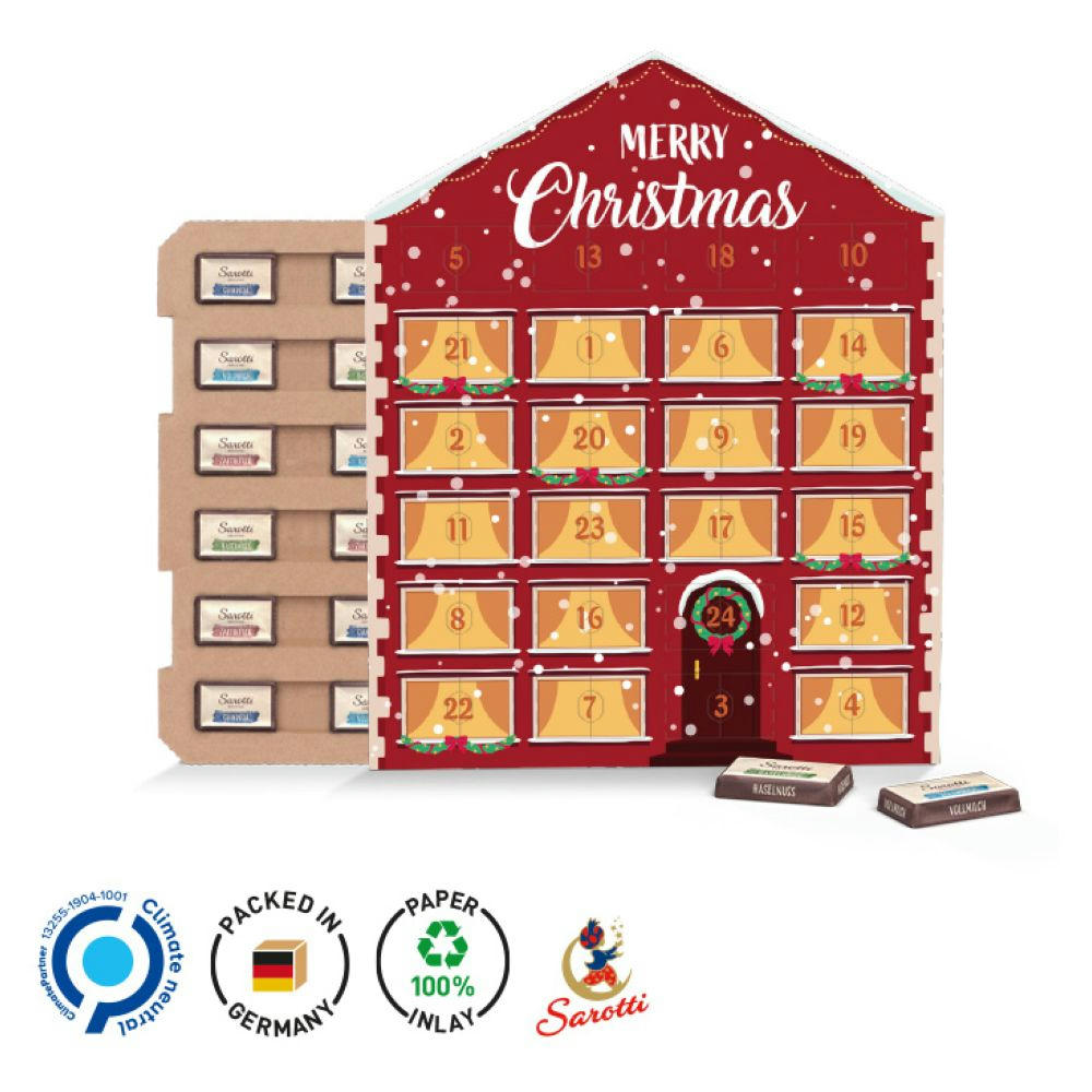 Täfelchen Kalender ECO in Hausform, Inlay aus 100 % Papier, Vollkartonhülle individuell bedruckt. Inhalt: 24 Alpenmilch-Schokotäfelchen mit Fairtrade-Zutaten, eingewickelt in Pergaminpapier (kann über die Papiertonne entsorgt werden), 72 g