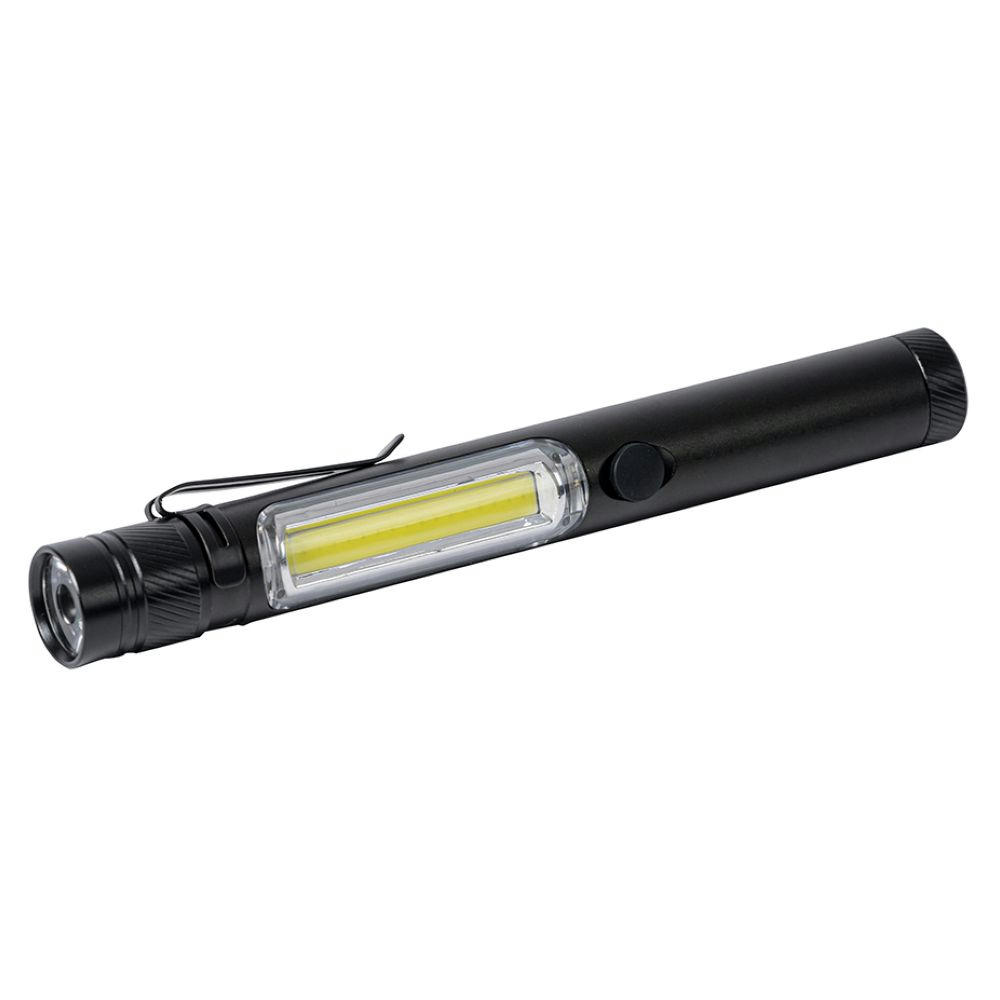 Mit 2 Funktionen einmal als Taschenlampe mit 1 LED, 40 Lumen und einmal als Arbeitsleuchte mit COB LED 220 Lumen. Mit Magnet am Ende zur Fixierung der Lampe an magnetischen Flächen beide Befestigungsarten ermöglichen ein freihändiges Arbeiten.und mit Clip