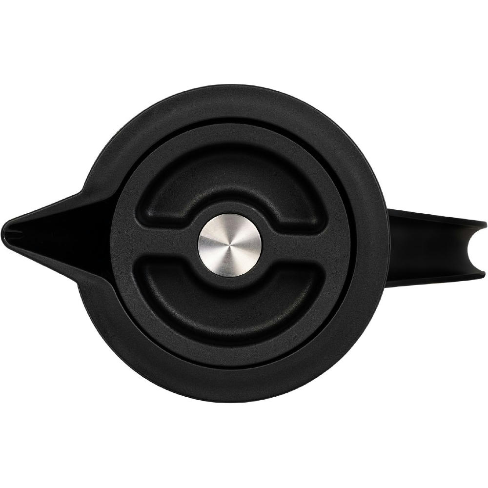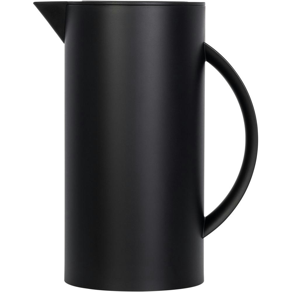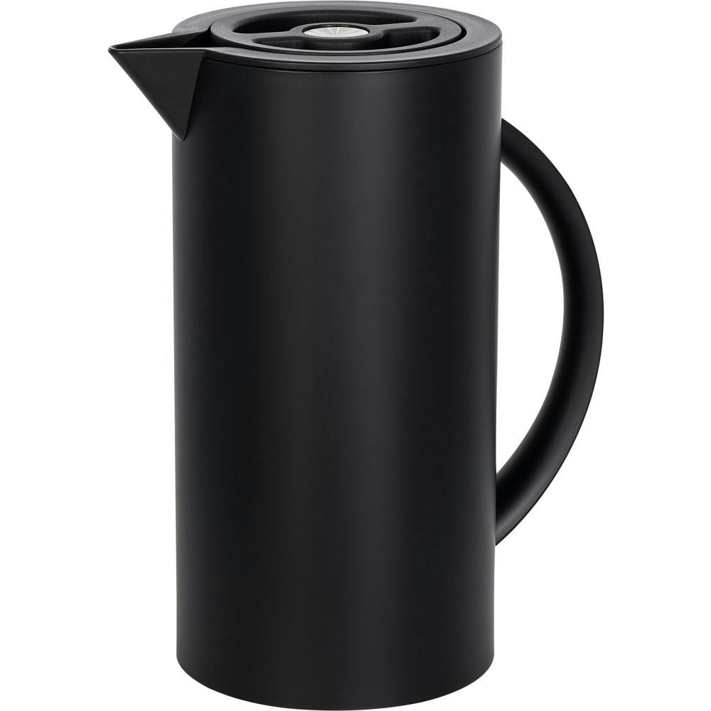 Schwarz matte Thermoskanne mit verspiegeltem Glaskolben als Isolierbehälter. Schraubdeckel mit Druckknopf für komfortables Ausgießen.