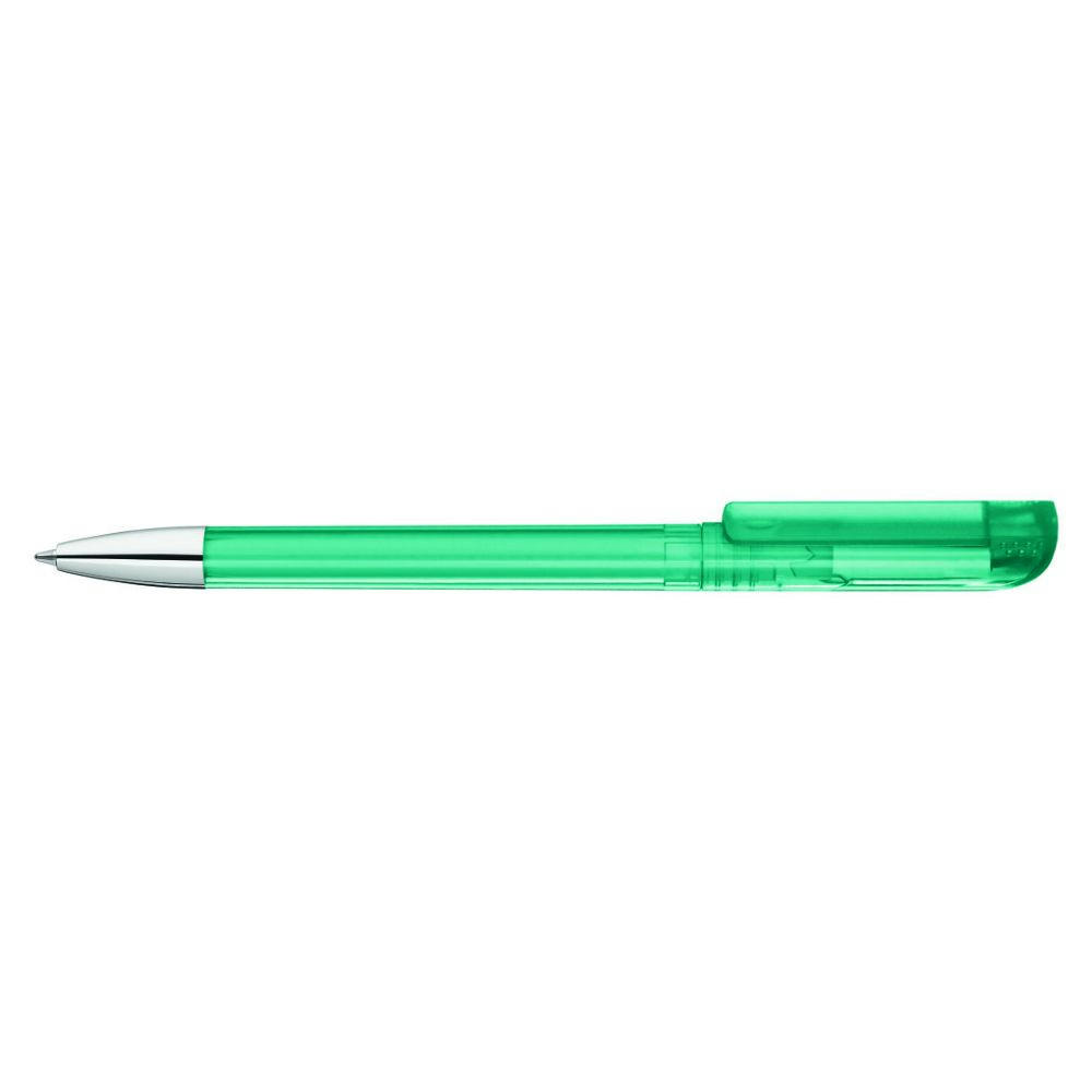 Drehkugelschreiber mit transparent glänzendem Gehäuse, gefrosteter Clipoberfläche und Spitze glanzverchromt.