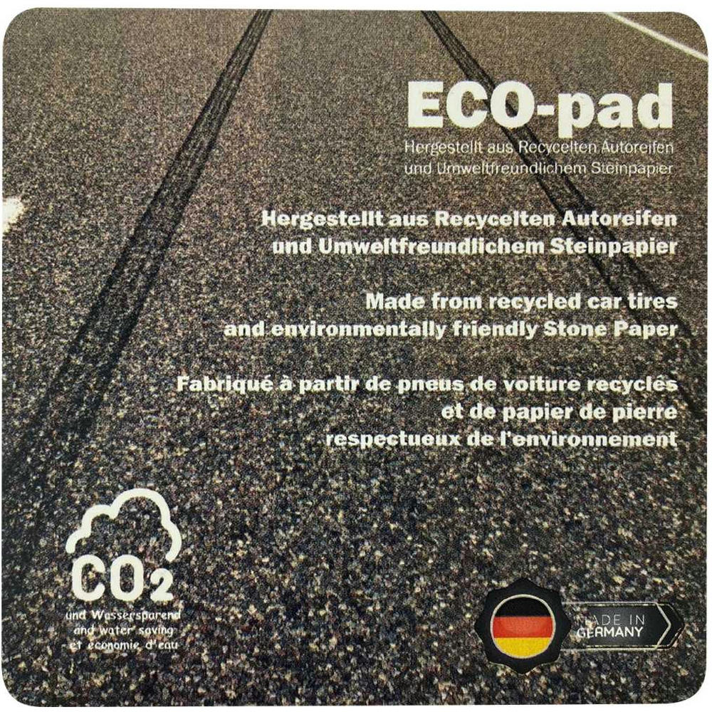 Unterseite aus 100 % in Deutschland recycelten Autoreifen ( 75 % Anteil vom Artikel), Oberfläche aus umweltfreundlichem Steinpapier, das in der Herstellung nur einen Bruchteil der Energie und Wasser benötigt. CO2 wird bei Steinpapier = 474 KG und bei normalem Papier ca. 1431 KG produziert. Made in Germany. Inkl. Druck auf der Vorderseite.