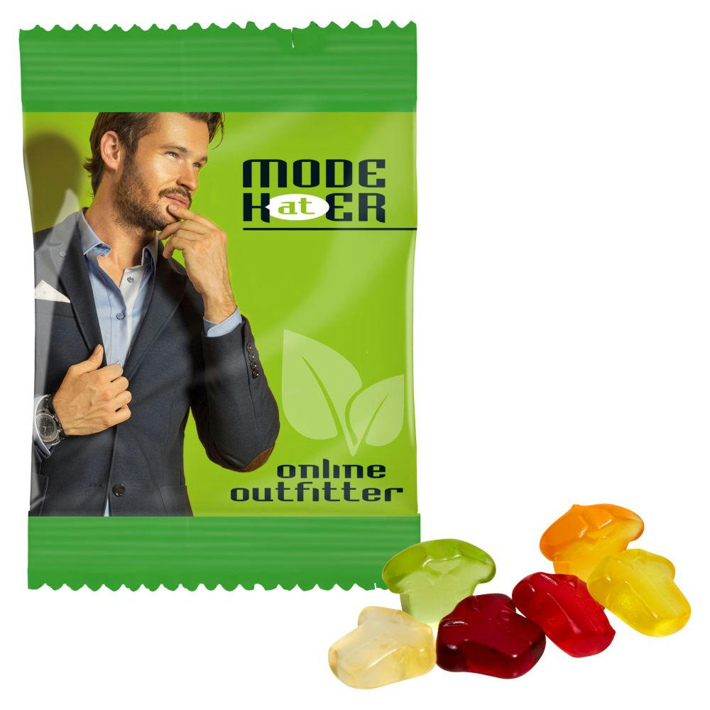 Entwickeln Sie mit uns Ihre ganz persönliche Fruchtgummi, vegan mit Pektin, farblich und geschmacklich bunt gemischt, in glänzend- oder matt-kaschiertem, transparentem alternativ weißem Werbetütchen verpackt. Fruchtgehalt 10%. Haltbarkeit: ca. 12 Monate. Inkl. 4c-Druck. Hinweis: Produktionstechnisch bedingte Mehr- oder Mindermengen von maximal 10 % sind bei Sonderformen unvermeidbar und zu akzeptieren.