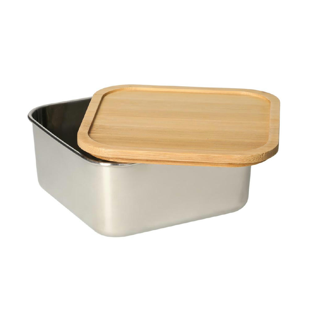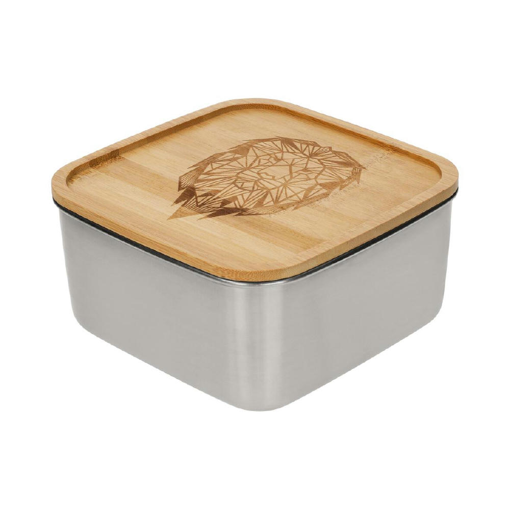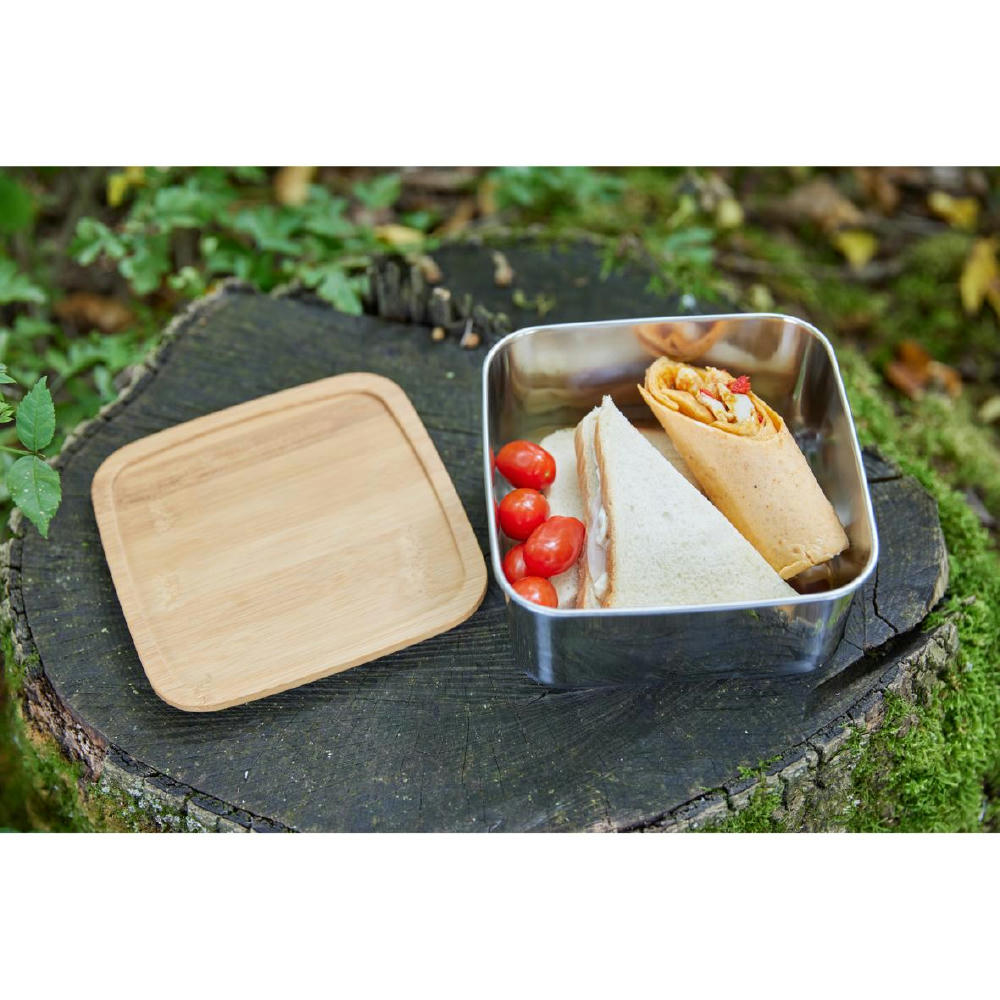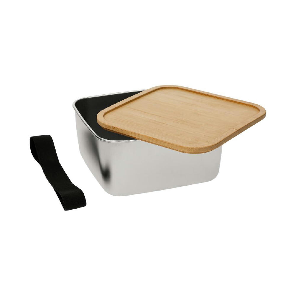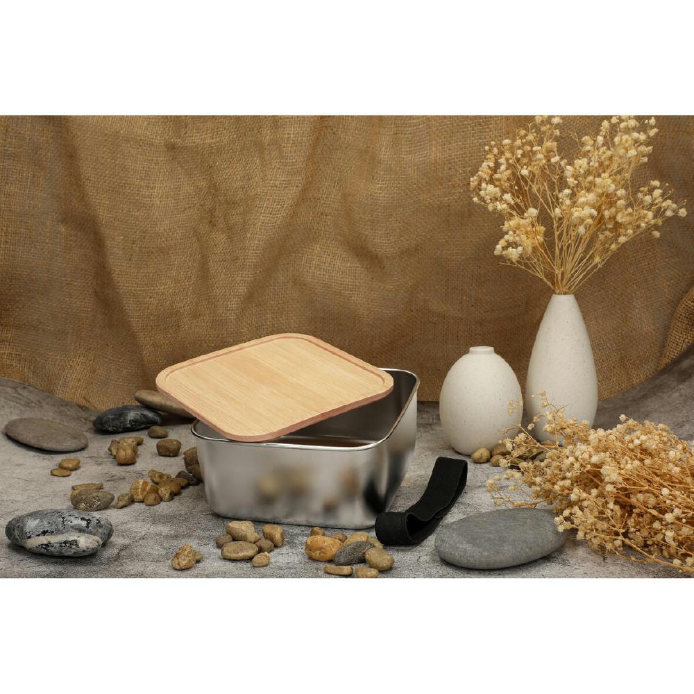Stylische Lunchbox mit einer Schale aus Edelstahl und einem Deckel aus Bambus. Verschlossen wird die Box mittels eines schwarzen Gummibands.