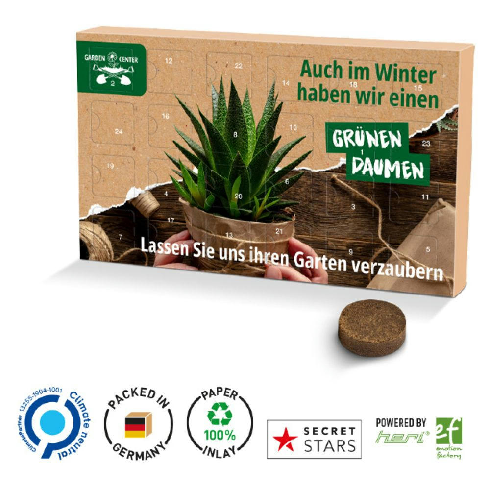 Adventskalender mit Vollkartonhülle, Inlay aus Papier, gefüllt mit 24 Substrattabletten als Erde und 24 Samentütchen in 12 unterschiedlichen Sorten, individuell bedruckbar. Preis inkl. 4-c Druck.
