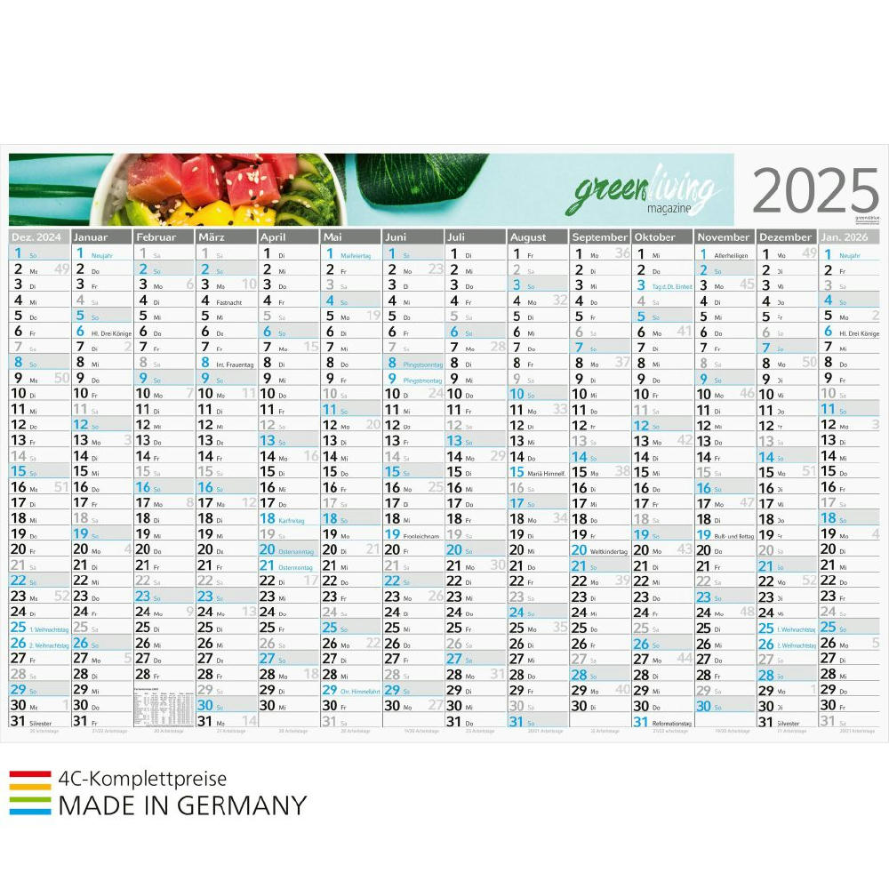 Wandplaner aus Recyclingpapier mit dem "blauen Engel" mit einem modernen Kalendarium in blau oder individueller Schmuckfarbe. Inklusive Jahreszahl am Kopf und Werbeeindruck in 4C.