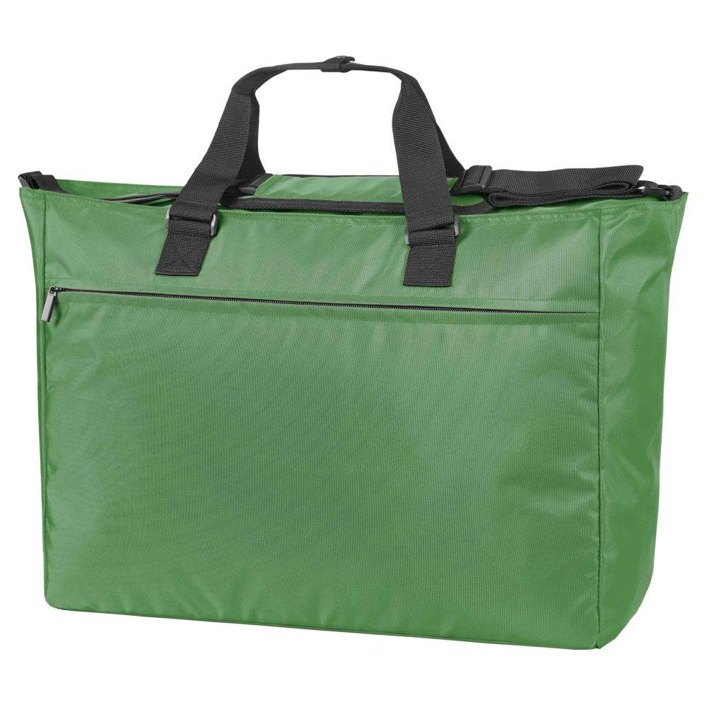 moderner, leicht gepolsterter Weekender; rPET-Obermaterial; großes Hauptfach mit 2-Wege-Reißverschluss; Reißverschluss-Vortasche; flaches Reißverschlussfach innen; beidseitig längenverstellbarer Tragegurt mit genähtem Schulterpolster; Handgriffe mit Druckknopfmanschette