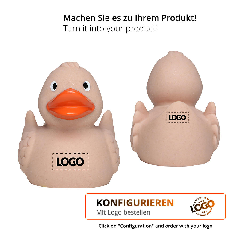 Die Weizen-Ente überzeugt durch ihre besondere Materialkombination: Sie besteht zu aus natürlichem Weizenstroh und zu aus strapazierfähigem PVC. Der beigemischte Weizen verleiht der Oberfläche eine feine, natürliche Textur und sorgt für eine angenehm matte Haptik. Genutzt wird dabei der Teil der Weizenpflanze, der nicht als Lebensmittel dient. Durch diese innovative Mischung entsteht ein aufmerksamkeitsstarker Werbeartikel mit authentischem Look und besonderem Charakter. - - Ein sympathisches Geschenk mit Werbewirkung – ob als Klassiker im Bad oder als nachhaltiger Hingucker auf Messen und Events. Die Ente eignet sich hervorragend für die Werbeanbringung auf dem Bürzel oder der Brust.