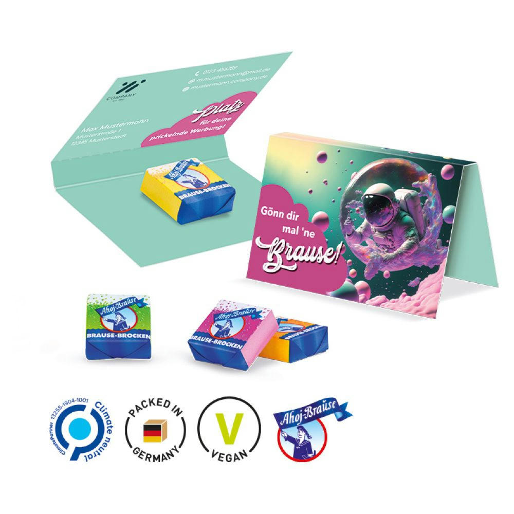 Aufklappbare Werbekarte im Visitenkartenformat, weißer Karton, mit praktischer Abreißperforation, individuell bedruckt. Inhalt: Ahoj-Brause Brocken, vegan, 8 g,