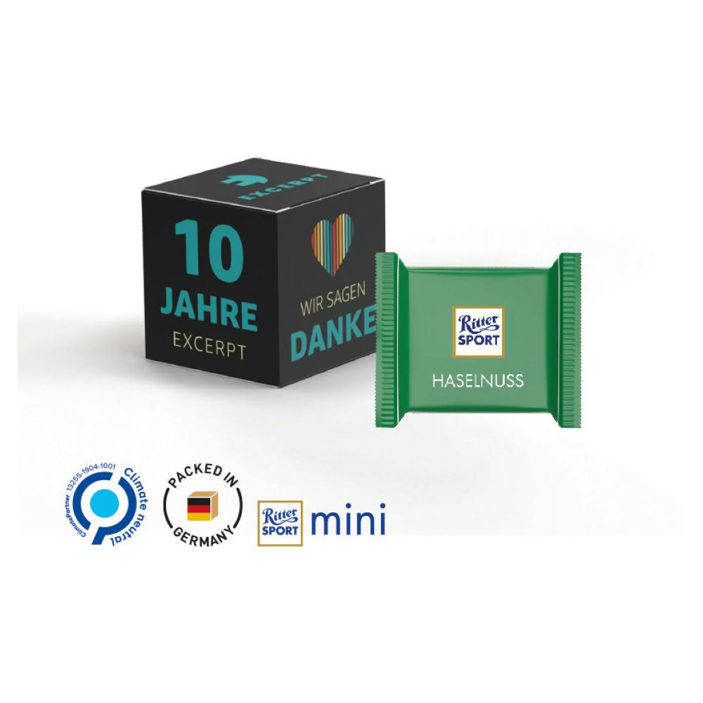Würfelförmige Werbeverpackung aus weißem Karton, individuell bedruckt. Inhalt: Ritter SPORT Mini Schokolade, Edelvollmilch (nur sortenrein), 66 g