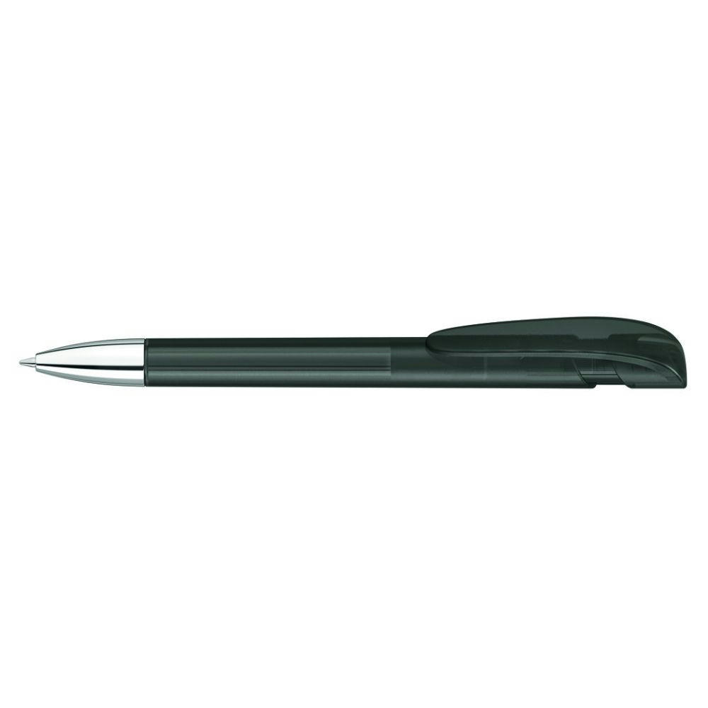 Druckkugelschreiber mit transparent gefrostetem Gehäuse, breitem Bogenclipdrücker und silberner Spitze glanzverchromt.