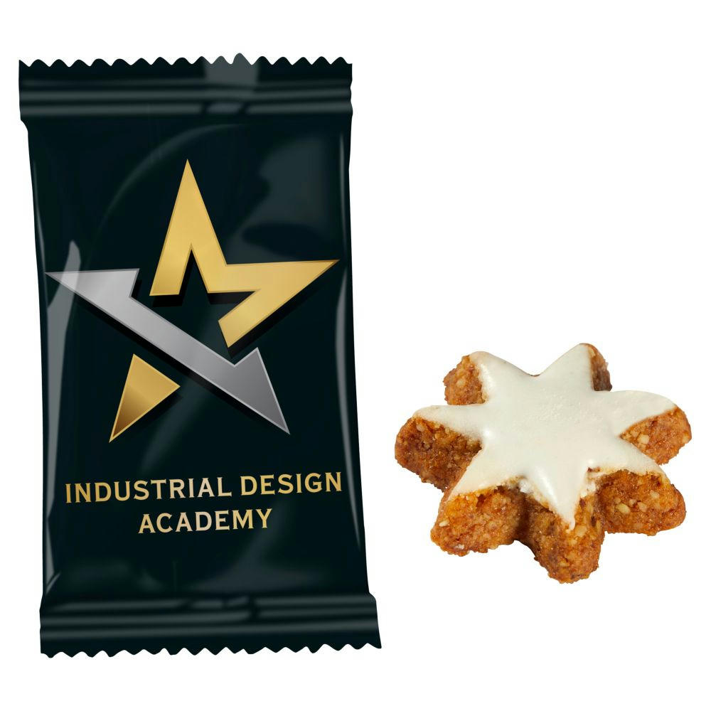 Zimtstern aus feinster Haselnuss-Mandel-Mischung mit Zuckerguss in glänzend- oder matt-kaschiertem weißem Flowpack einzeln verpackt. Haltbarkeit: ca. 6 Monate.