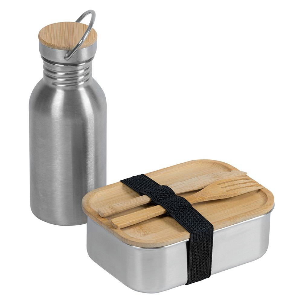 Tolles und hochwertiges Geschenk-SET bestehend aus einer Lunchbox aus Edelstahl mit Bambusdeckel und einer doppelwandigen und vakuumisolierten Isolierflasche 500 ml aus Edelstahl, inkl. Edelstahl Schraubverschluss mit Bambusoberfläche und Tragehenkel. Verpackt ist das SET in einem schönen Geschenkkarton.