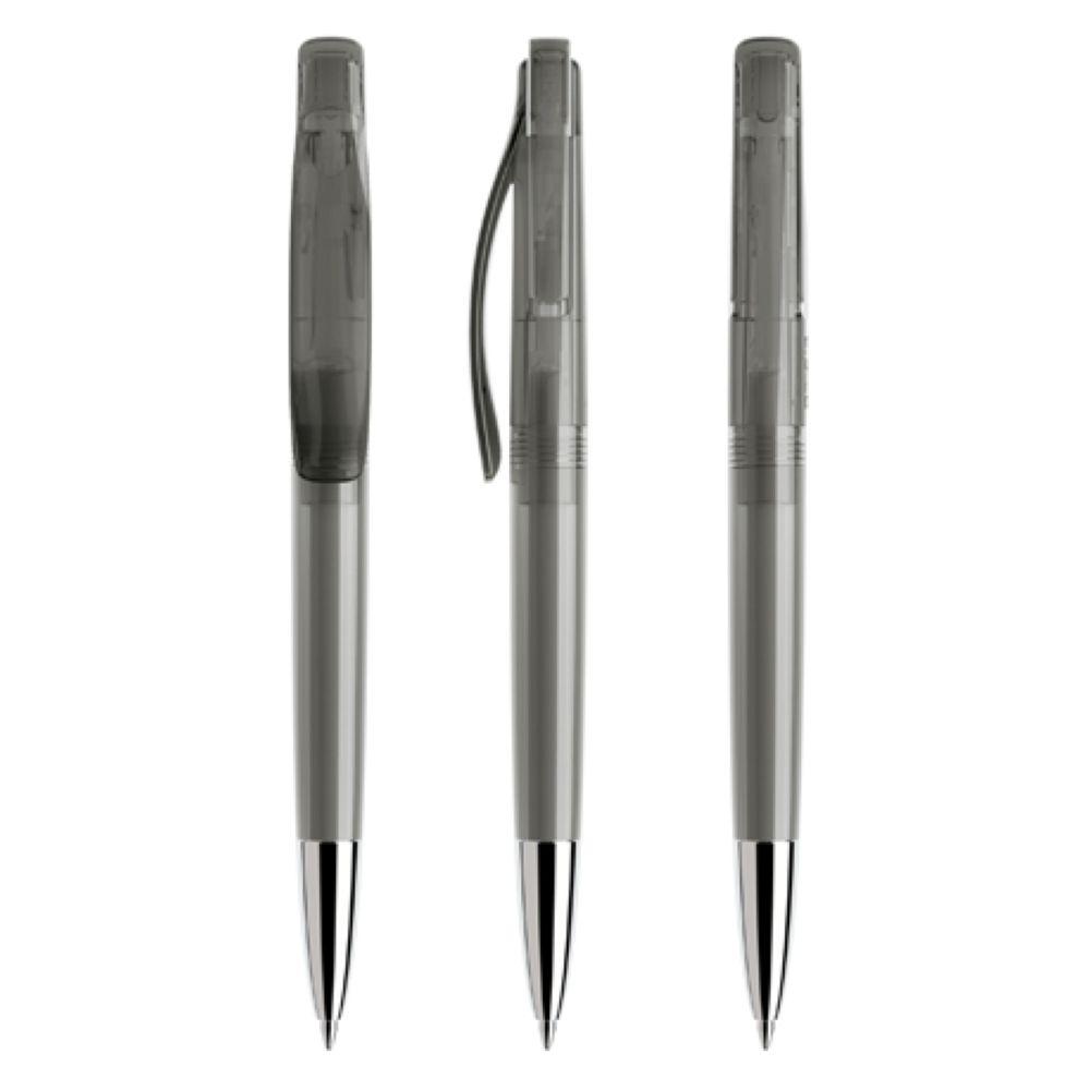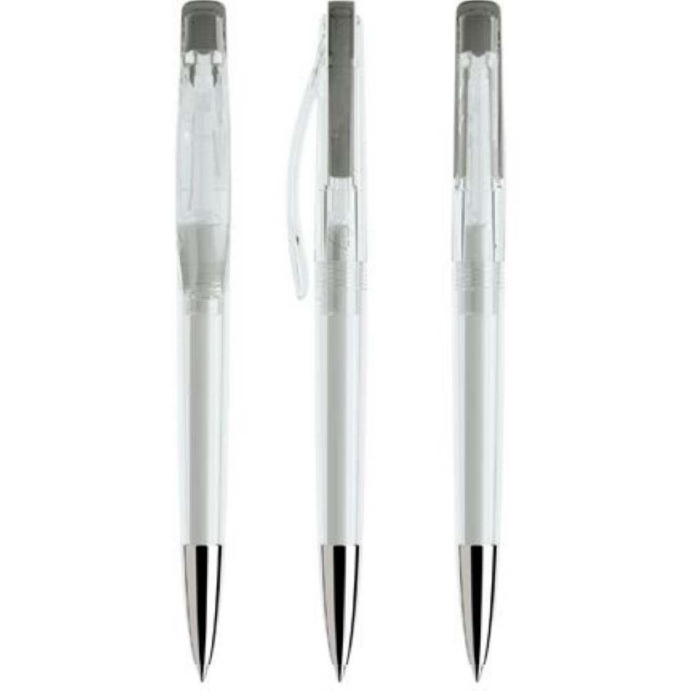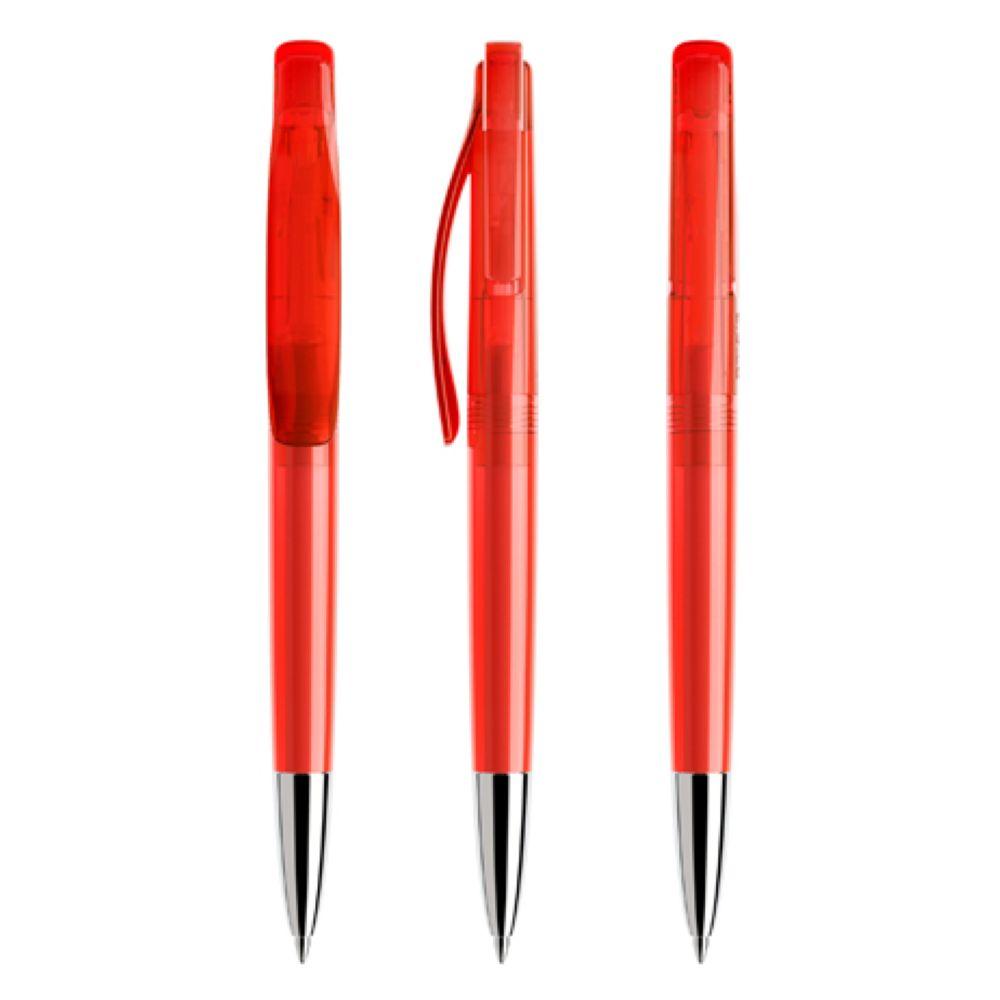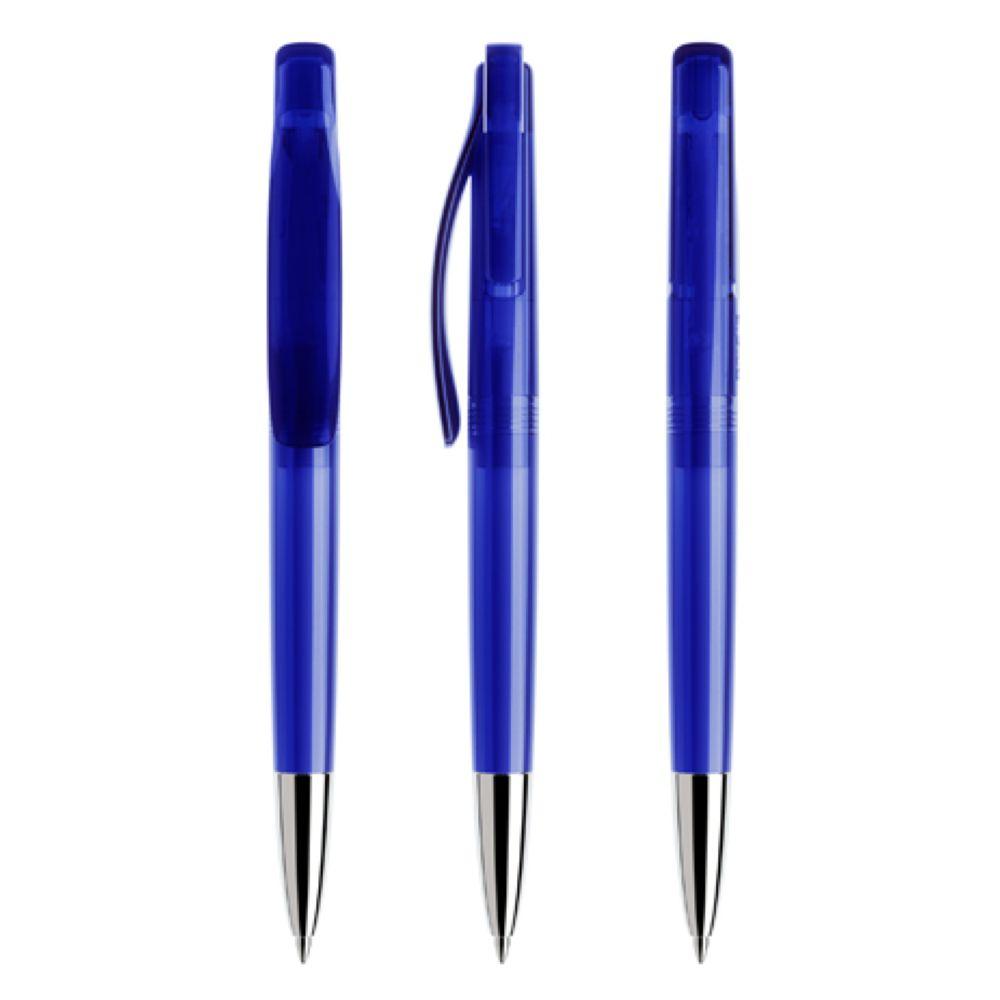 Der lang gestreckte Druckknopf verleiht ihm seine ganz individuelle Linie. Wie immer bei Prodir sind die Wände der Bauteile auf maximale Stärke ausgelegt. Das sorgt für intensiv leuchtende Farben und angenehme Schwere in der Hand. In der Ausführung mit transparentem Gehäuse und polierter Metallspitze (PTC) lieferbar in vier Standardfarben, hergestellt mit einem Rezyklatanteil von 50%, gekennzeichnet mit dem internationalen Recycling-Symbol. Sondergehäusefarben ab 10.000 Stück. Fünf Druckflächen für Werbeanbringungen stehen zur Verfügung. Der beidseitig bedruckbare Druckknopf kann in Farbe und Oberfläche vom Gehäuse abgesetzt werden. Ausgestattet mit der umweltfreundlichen auswechselbaren FLOATING BALL® lead free-Großraummine 1.0, Schreiblänge 5.000 m, Schreibfarbe Blau oder Schwarz.