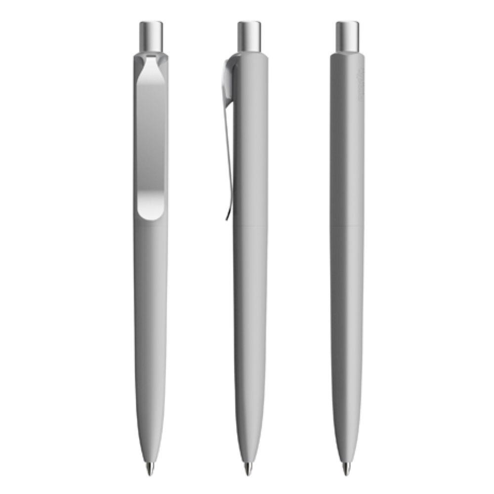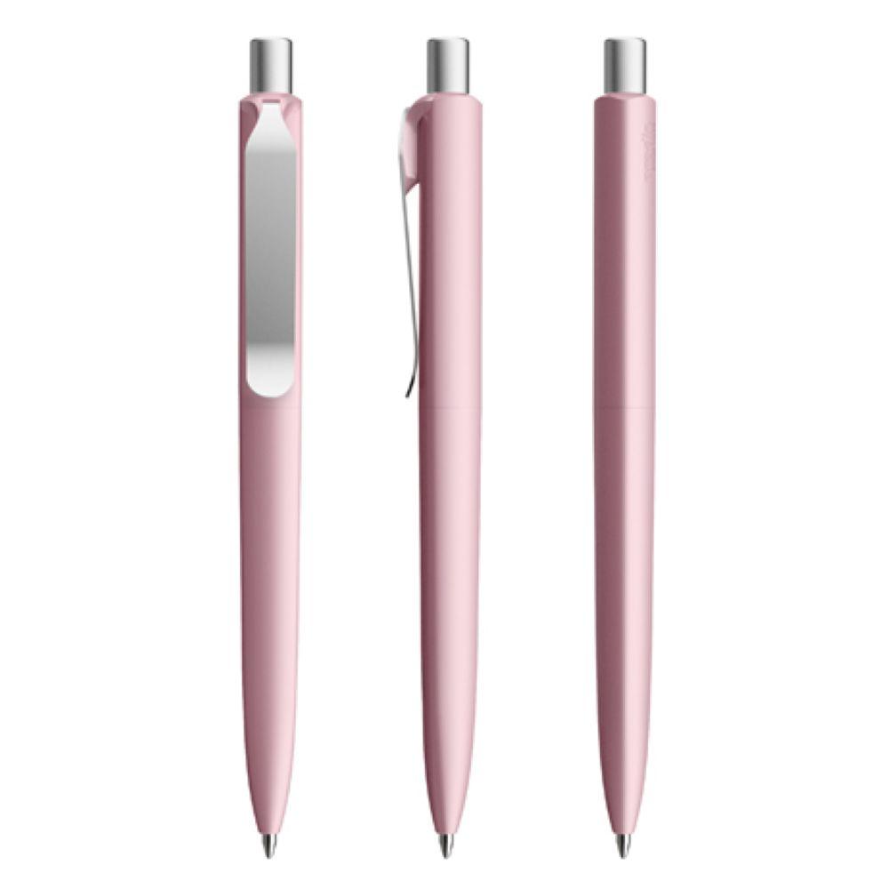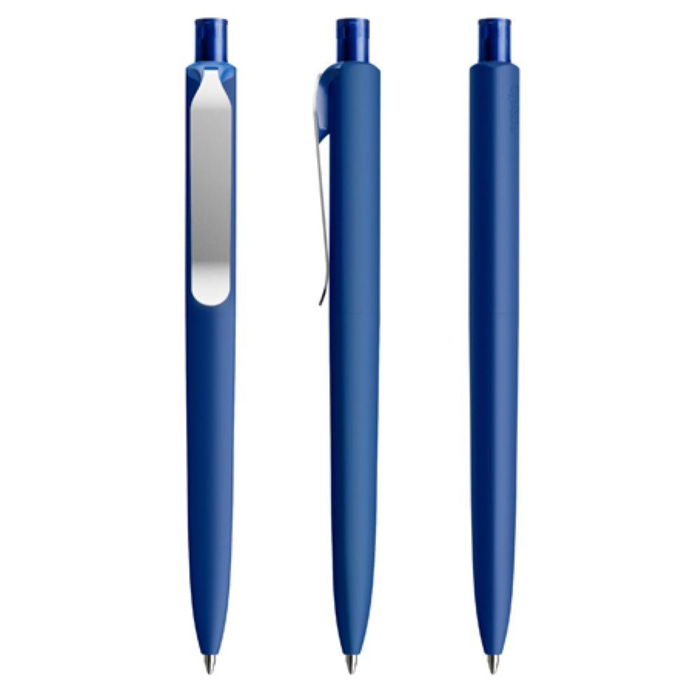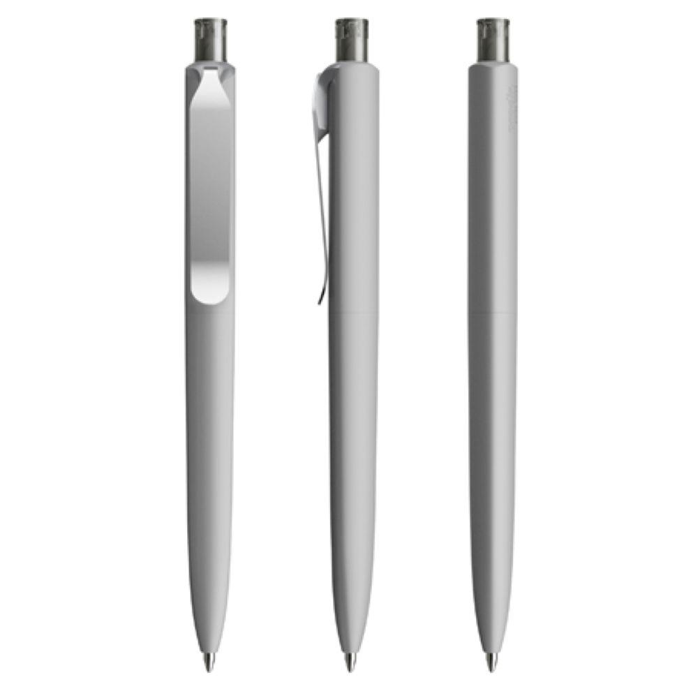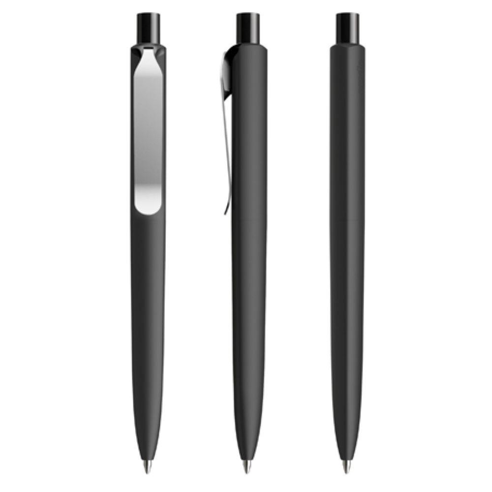 Die Ikone eines klassischen Schreibgerätes. Wertige Clip-Druckknopf-Kombinationen aus Metall machen den DS8 Metall-Clip noch vielseitiger. Ein ausgewogener Material-Mix aus Metall und Kunststoff, der Marken gekonnt in Szene setzt. Metall-Clips in verschiedenen Finishs verleihen ihm einen luxuriösen Touch. Die farblich absetzbaren Clip-Holder bieten eine Möglichkeit, neben der Primärfarbe auch die Zweitfarbe der Corporate Identity harmonisch umzusetzen. In der Ausführung mit Schaft in Soft Touch-Oberfläche (PSR) lieferbar in zehn Standardfarben, hergestellt mit einem Rezyklatanteil von 100% (Schwarz) oder 50% (alle anderen Farben), gekennzeichnet mit dem internationalen Recycling-Symbol. Sondergehäusefarben ab 5.000 Stück. Fünf Druckflächen für Werbeanbringungen stehen zur Verfügung. Die Standardausführung ist mit Silber satiniertem Clip und poliertem oder satiniertem Metalldruckknopf ausgestattet. Alternativ stehen satinierte Metallclips und Metalldruckknöpfe in galvanisiertem Schwarz oder Graphit zur Auswahl. Ausgestattet mit der umweltfreundlichen auswechselbaren FLOATING BALL® lead free-Großraummine 1.0, Schreiblänge 5.000 m, Schreibfarbe Blau oder Schwarz.